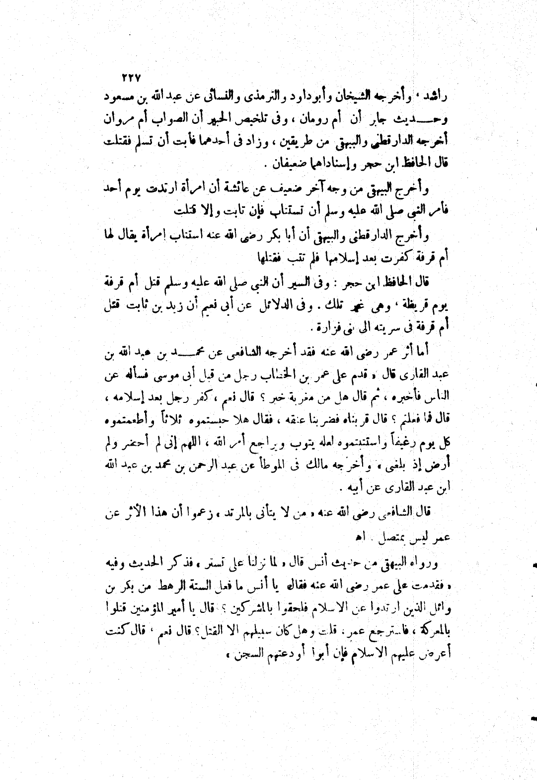 أما أثر عمر رضى الله عنه فقد أخرجه الشافعي عن محمد بن عبد الله بن عبد القارى قال (قدم على عمر بن الخطاب رجل من قبل أبى موسى فسأله عن الناس فأخبره، ثم قال هل من مغربة خبر؟ قال نعم، كفر رجل بعد إسلامه، قال فما فعلتم؟ قال قربناه فضربنا عنقه، فقال هلا حبستموه ثلاثا وأطعمتموه كل يوم رغيفا واستتبتموه لعله يتوب ويراجع أمر الله، اللهم إنى لم أحضر ولم أرض إذ بلغى) وأخرجه مالك في الموطأ عن عبد الرحمن بن محمد بن عبد الله ابن عبد القارى عن أبيه قال الشافعي رضى الله عنه (من لا يتأنى بالمرتد) زعموا أن هذا الاثر عن عمر ليس بمتصل.