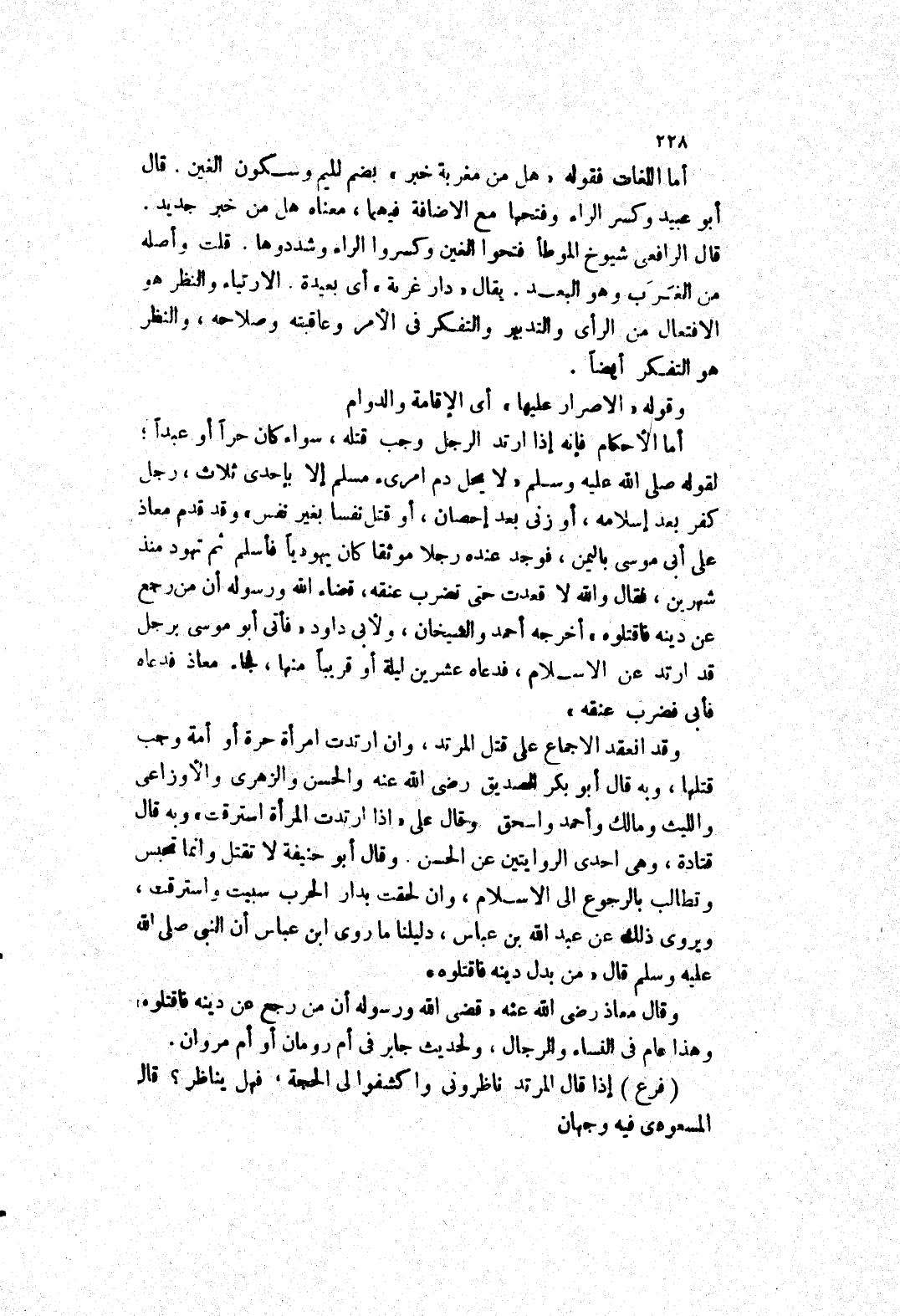 وقوله (الاصرار عليها) أي الاقامة والدوام أما الاحكام فإنه إذا ارتد الرجل وجب قتله، سواء كان حرا أو عبدا، لقوله صلى الله عليه وسلم (لَا يَحِلُّ دَمُ امْرِئٍ مُسْلِمٍ إلَّا بِإِحْدَى ثلاث، رجل كفر بعد إسلامه، أو زنى بعد إحصان، أو قتل نفسا بغير نفس) وقد قدم معاذ على أبى موسى باليمن، فوجد عنهد رجلا موثقا كان يهوديا فأسلم ثم تهود منذ شهرين، فقال والله لاقعدت حتى تضرب عنقه، قضاء الله ورسوله أن من رجع عن دينه فاقتلوه) أخرجه أحمد والشيخان، ولابي داود (فأتى أبو موسى برجل قد ارتد عن الاسلام، فدعاه عشرين ليلة أو قريبا منها، فجاء معاذ فدعاه فأبى فضرب عنقه) وقد انعقد الاجماع على قتل المرتد، وان ارتدت امرأة حرة أو أمة وجب قتلها، وبه قال أبو بكر الصديق رضى الله عنه والحسن والزهرى والاوزاعي