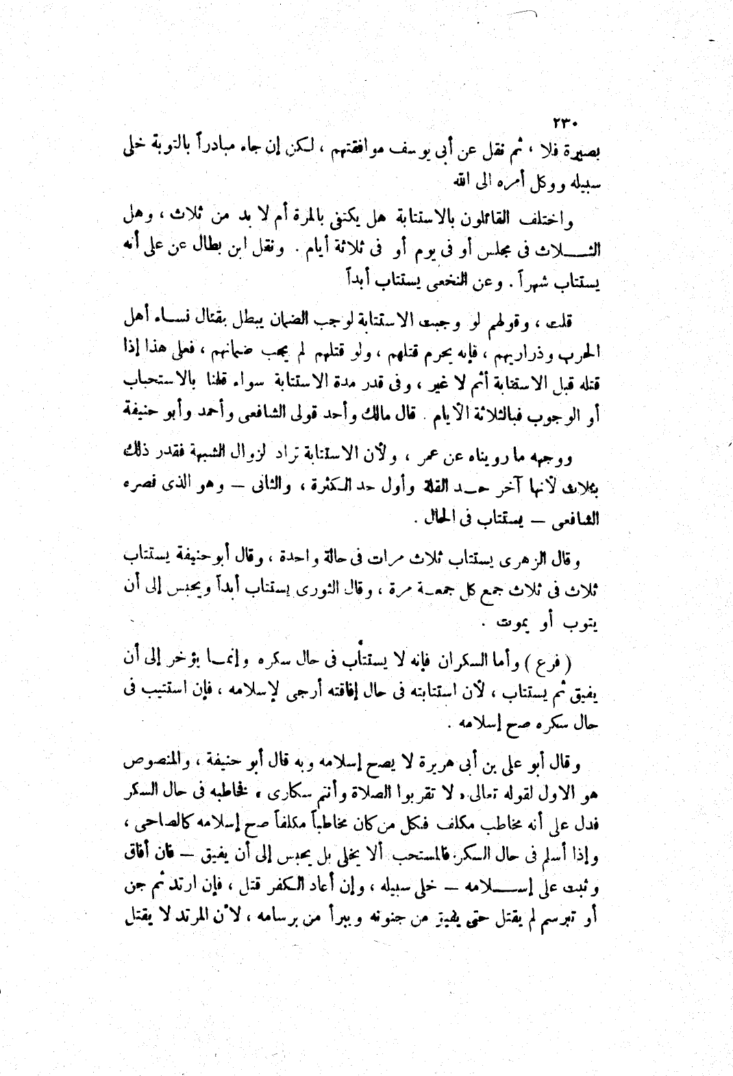 وعن النخعي يستتاب أبدا قلت، وقولهم لو وجبت الاستتابة لوجبت الضمان يبطل بقتال نساء أهل الحرب وذراريهم، فإنه يحرم قتلهم، ولو قتلهم لم يجب ضمانهم، فعلى هذا إذا قتله قبل الاستتابة أثم لاغير، وفى قدر مدة الاستتابة سواء قلنا بالاستحباب