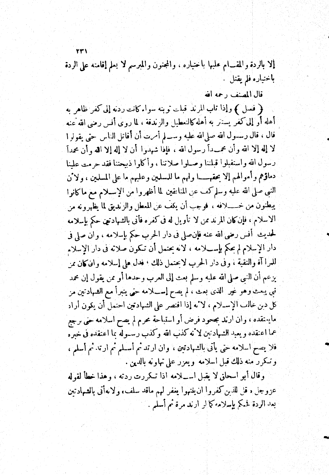 قَالَ، قَالَ رَسُولُ اللَّهِ صَلَّى اللَّهُ عَلَيْهِ وَسَلَّمَ أمرت أن أقاتل الناس حتى يقولوا لَا إلَهَ إلَّا اللَّهُ وَأَنَّ مُحَمَّدًا رَسُولُ الله، فإذا شهدوا أَنْ لَا إلَهَ إلَّا اللَّهُ وَأَنَّ مُحَمَّدًا رسول الله واستقبلوا قبلتنا وصلوا صلاتنا، وأكلوا ذبيحتنا فقد حرمت علينا دماؤهم وأموالهم إلا بحقها ولهم ما للمسلمين وعليهم ما على المسلمين، ولان النبي صلى الله عليه وسلم كف عن المنافقين لما أظهروا من الاسلام مع ما كانوا يبطنون من خلافه، فوجب أن يكف عن المعطل والزنديق لما يظهرونه من الاسلام، فإن كان المرتد ممن لا تأويل له في كفره فأتى بالشهادتين حكم بإسلامه لحديث أنس رضى الله عنه فإن صلى في دار الحرب حكم بإسلامه، وان صلى في دار الاسلام لم يحكم بإسلامه، لانه يحتمل أن تكون صلاته في دار الاسلام للمرأة والتقية، وفى دار الحرب لا يحتمل ذلك، فدل على إسلامه وان كان ممن يزعم أَنَّ النَّبِيَّ صَلَّى اللَّهُ عَلَيْهِ وَسَلَّمَ بَعَثَ إلى العرب وحدها أو ممن يقول إن محمدا نبى يبعث وهو غير الذى بعث، لم يصح إسلامه حتى يتبرأ مع الشهادتين من كل دين خالف الاسلام، لانه إذا اقتصر على الشهادتين احتمل أن يكون أراد ما يعتقده، وان ارتد بجحود فرض أو استباحة محرم لم يصح اسلامه حتى يرجع عما اعتقده ويعيد الشهادتين لانه كذب الله وكذب رسوله بما اعتقده في خبره فلا يصح اسلامه حتى يأتي بالشهادتين، وان ارتد ثم أسلم ثم ارتد ثم أسلم، وتكرر منه ذلك قبل اسلامه ويعزر على تهاونه بالدين.