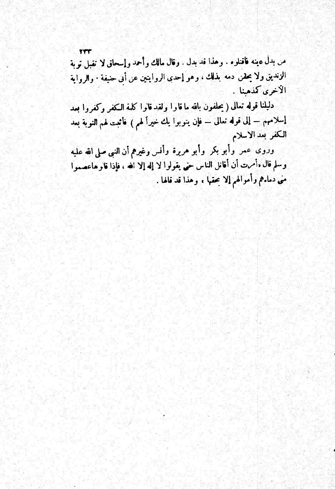 دليلنا قوله تعالى (يحلفون بالله ما قالوا ولقد قالوا كلمة الكفر وكفروا بعد إسلامهم إلى قوله تعالى فإن يتوبوا بك خيرا لهم) فأثبت لهم التوبة بعد الكفر بعد الاسلام وروى عمر وأبو بكر وأبو هريرة وأنس وَغَيْرِهِمْ إنَّ النَّبِيَّ صَلَّى اللَّهُ عَلَيْهِ وَسَلَّمَ قَالَ (أمرت أن أقاتل الناس حتى يقولوا لا إله إلا الله، فإذا قالوها عصموا منى دماءهم وأموالهم إلا بحقها) وهذا قد قالها.