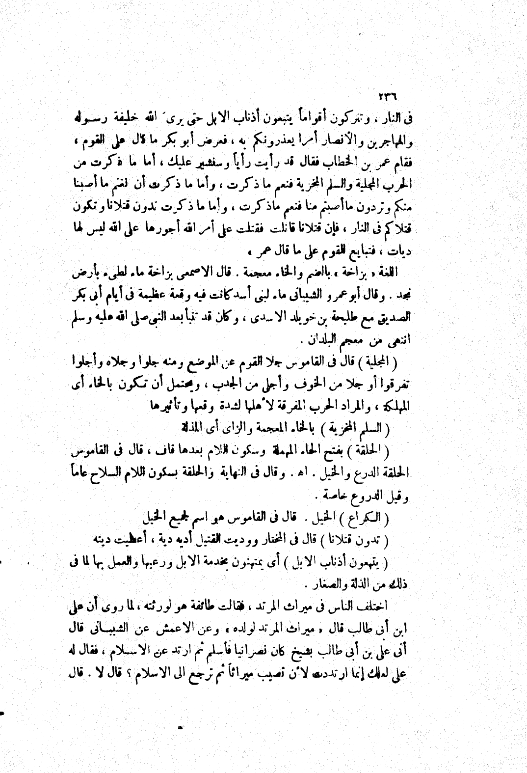 في النار، وتتركون أقواما يتبعون أذناب الا بل حتى يرى الله خليفة رسوله والمهاجرين والانصار أمرا يعذرونكم به، فعرض أبو بكر ما قال على القوم، فقام عمر بن الخطاب فقال قد رأيت رأيا وسنشير عليك، أما ما ذكرت من الحرب المجلية والسلم المخزية فنعم ما ذكرت، وأما ما ذكرت أن نغنم ما أصبنا
