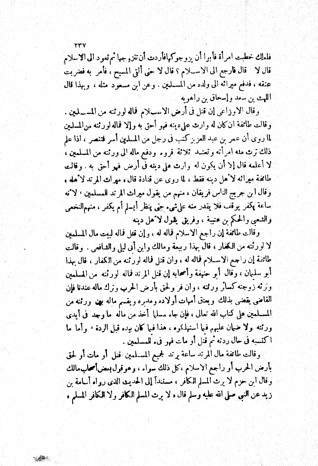 وقالت طائفة مال المرتد ساعة يرتد لجميع المسلمين قتل أو مات أو لحق بأرض الحرب أو راجع الاسلام، كل ذلك سواء، وهو قول بعض أصحاب مالك وقال ابن حزم لا يرث المسلم الكافر، مستندا إلى الحديث الذى رواه أُسَامَةَ بْنِ زَيْدٍ عَنْ النَّبِيِّ صَلَّى اللَّهُ عَلَيْهِ وَسَلَّمَ قَالَ (لا يرث المسلم الكافر ولا الكافر المسلم)