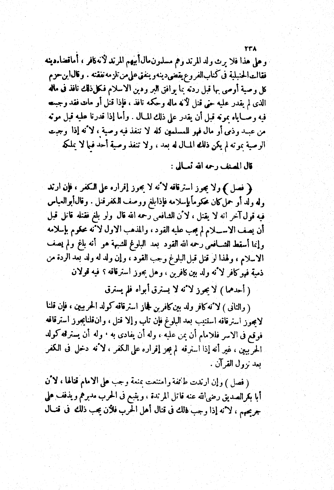 وقال أبو العباس فيه قول آخر انه لا يقتل، لان الشافعي رحمه الله قال ولو بلغ فقتله قاتل قبل أن يصف الاسلام لم يجب عليه القود، والمذهب الاول لانه محكوم بإسلامه وإنما أسقط الشافعي رحمه الله القود بعد البلوغ للشبهة هو أنه بلغ ولم يصف الاسلام، ولهذا لو قتل قبل البلوغ وجب القود، وإن ولد له ولد بعد الردة من ذمية فهو كافر لانه ولد بين كافرين، وهو يجوز استرقاقه؟ فيه قولان