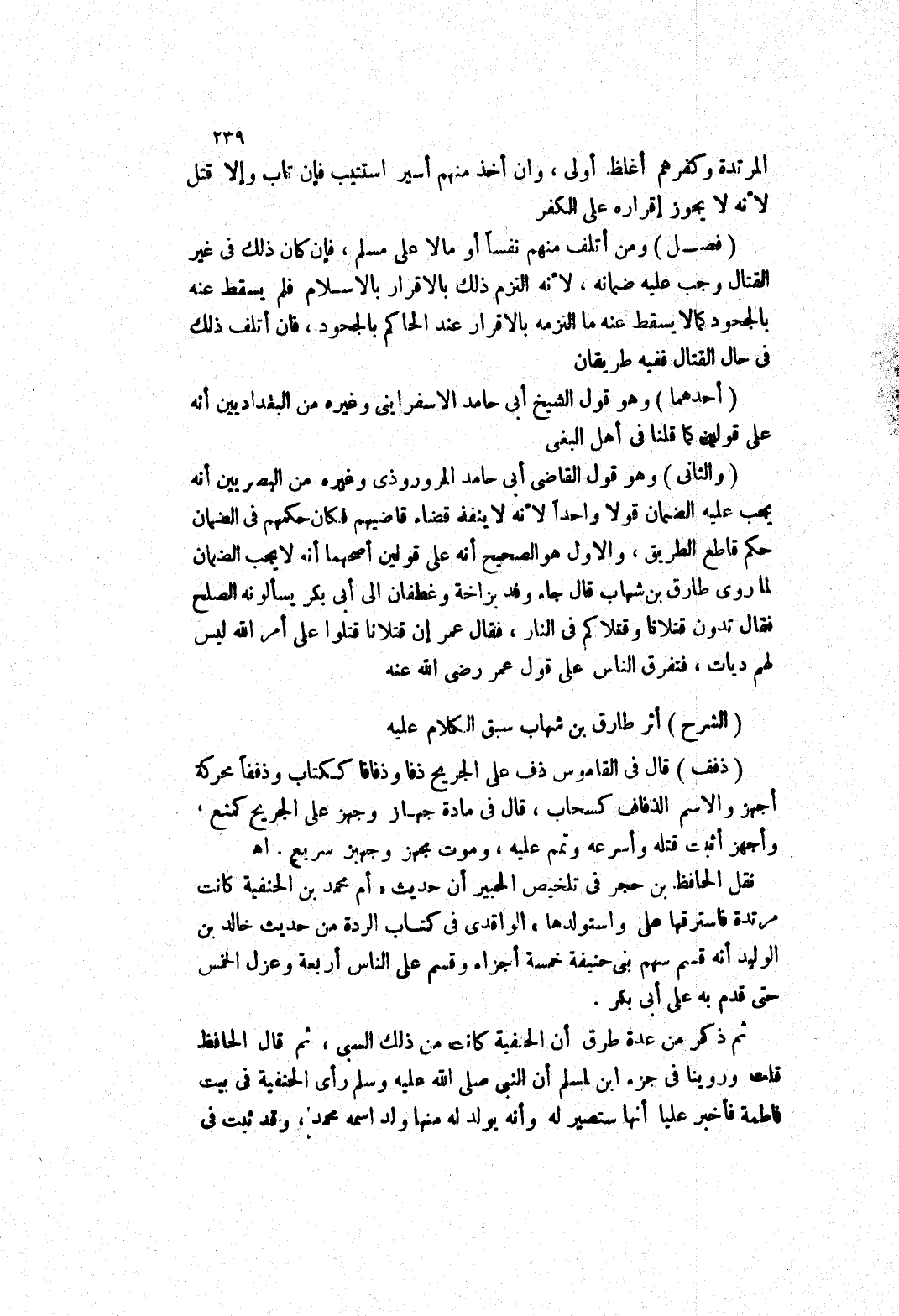 لهم ديات، فتفرق الناس على قول عمر رضى الله عنه (الشرح) أثر طارق بن شهاب سبق الكلام عليه (ذفف) قال في القاموسى ذف على الجريح ذفا وذفافا ككتاب وذففا محركة أجهز والاسم الذفاف كسحاب، قال في مادة جهاز وجهز على الجريح كمنع، وأجهز أثبت قتله وأسرعه وتمم عليه، وموت مجهز وجهيز سريع.