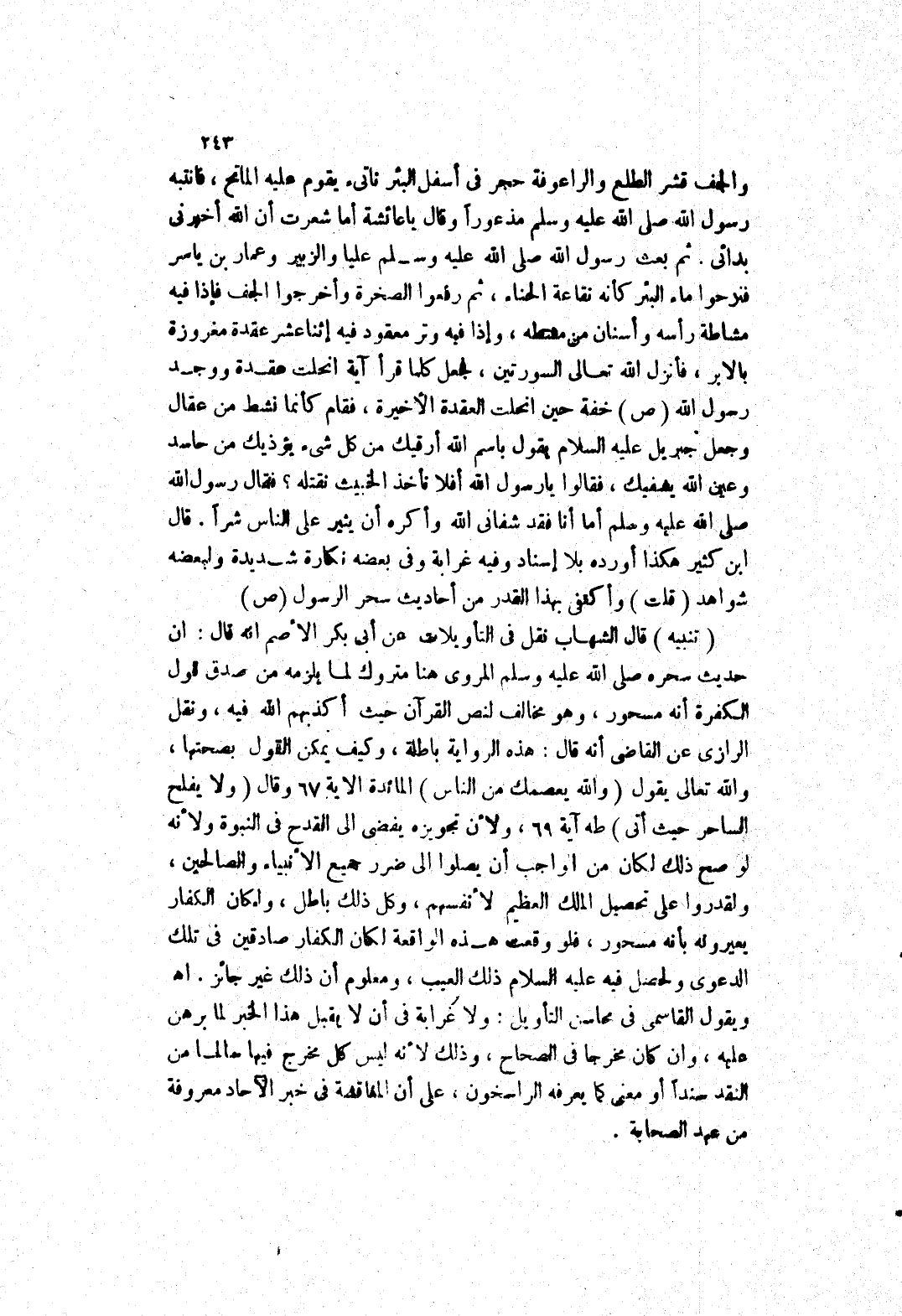 قال ابن كثير هكذا أورده بلا إسناد وفيه غرابة وفى بعضه نكارة شديدة ولبعضه شواهد (قلت) وأكتفى بهذا القدر من أحاديث سحر الرسول صلى الله عليه وسلم (تنبيه) قال الشهاب نقل في التأويلات عن أبى بكر الاصم انه قال: ان حديث سحره صلى الله عليه وسلم المروى هنا متروك لما يلزمه من صدق قول الكفرة أنه مسحور، وهو مخالف لنص القرآن حيث أكذبهم الله فيه، ونقل الرازي عن القاضى أنه قال: هذه الرواية باطلة، وكيف يمكن القول بصحتها، والله تعالى يقول (والله يعصمك من الناس) المائدة الآية 67 وقال (ولا يفلح الساحر حيث أتى) طه آية 69، ولان تجويزه يفضى إلى القدح في النبوة ولانه