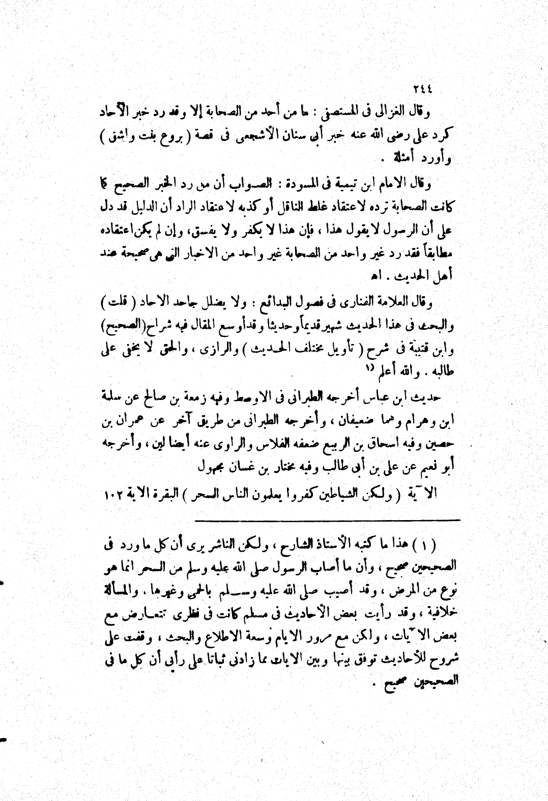 (1) هذا ما كتبه الاسناد السارح، ولكن الناشر يرى أن كل ما ورد في الصحيحين صحيح، وأن ما أصاب الرسول صلى الله عليه وسلم من السحر انما هو نوع من المرض، وقد أصيب صلى الله عليه وسلم بالحمى وغيرها، والمسألة خلافية، وقد رأيت بعض الاحاديث في مسلم كانت في نظرى تتعارض مع بعض الآيات، ولكن مع مرور الايام وسعة الاطلاع والبحث، وقفت على شروح للاحاديث توفق بينها وبين الايات مما زادني ثباتا على رأيى أن كل ما في الصحيحين صحيح.