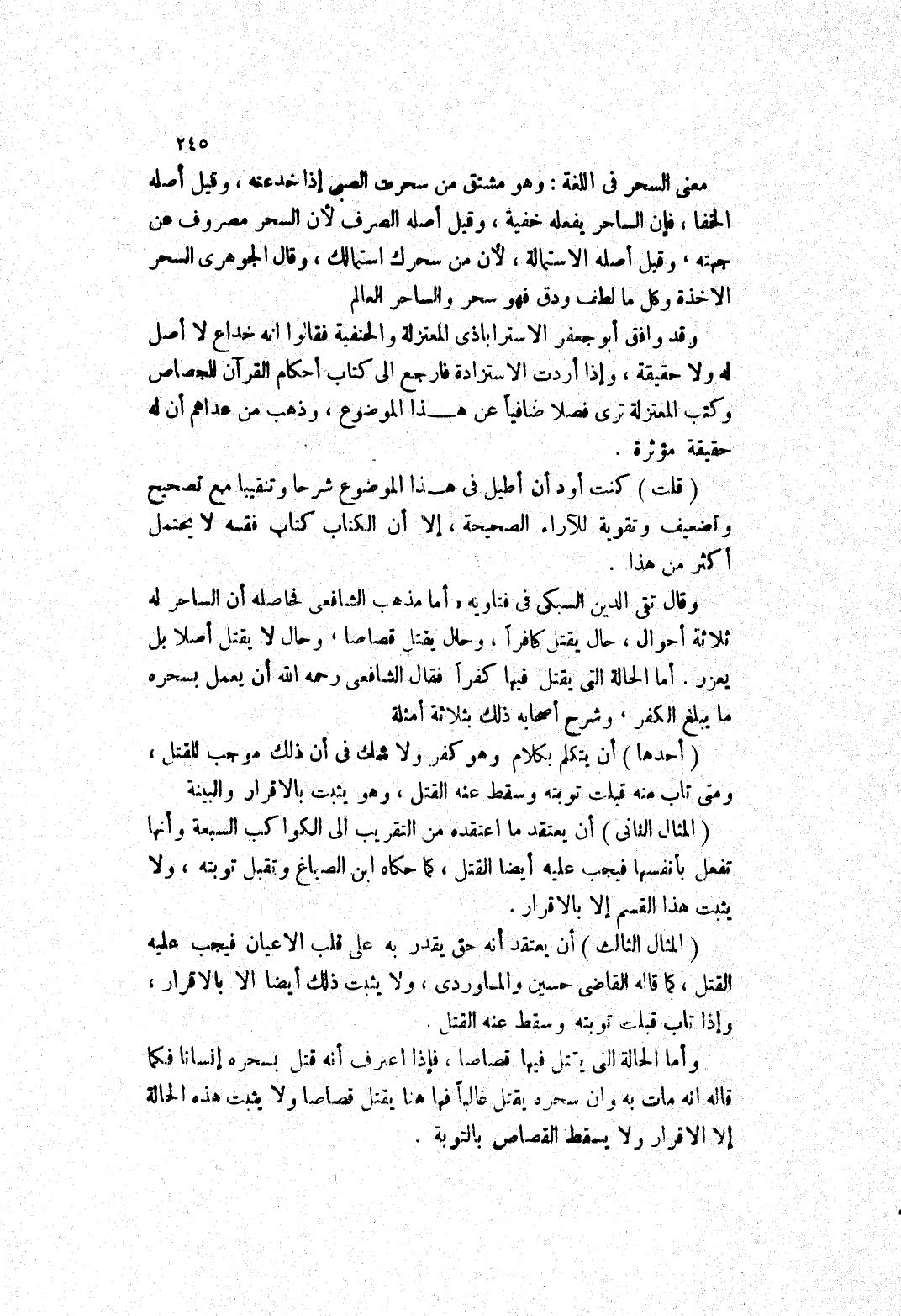 أما الحالة التى يقتل فيها كفرا فقال الشافعي رحمه الله أن يعمل بسحره ما يبلغ الكفر، وشرح أصحابه ذلك بثلاثة أمثلة (أحدها) أن يتكلم بكلام وهو كفر ولاشك في أن ذلك موجب القتل، ومتى تاب منه قبلت توبته وسقط عنه القتل، وهو يثبت بالاقرار والبينة (المثال الثاني) أن يعتقد ما اعتقده من التقريب إلى الكواكب السبعة وأنها تفعل بأنفسها فيجب عليه أيضا القتل، كما حكاه ابن الصباغ وتقبل توبته، ولا يثبت هذا القسم إلا بالاقرار.