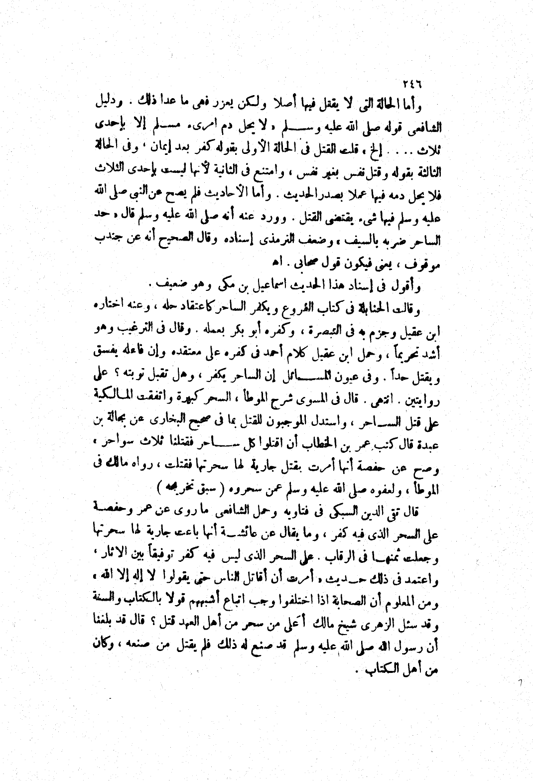 قال في المسوى شرح الموطأ، السحر كبيرة واتفقت المالكية على قتل الساحر، واستدل الموجبون للقتل بما في صحيح البخاري عن بجالة بن عبدة قال كتب عمر بن الخطاب أن اقتلوا كل ساحر فقتلنا ثلاث سواحر) وصح عن حفصة أنها أمرت بقتل جارية لها سحرتها فقتلت، رواه مالك في الموطأ، ولعفوه صلى الله عليه وسلم عمن سحروه (؟ سق تخريجه) قال تقى الدين السبكى في فتاويه وحمل الشافعي ما روى عن عمر وحفصة على السحر الذى فيه كفر، وما يقال عن عائشة أنها باعت جارية لها سحرتها وجعلت ثمنها في الرقاب.