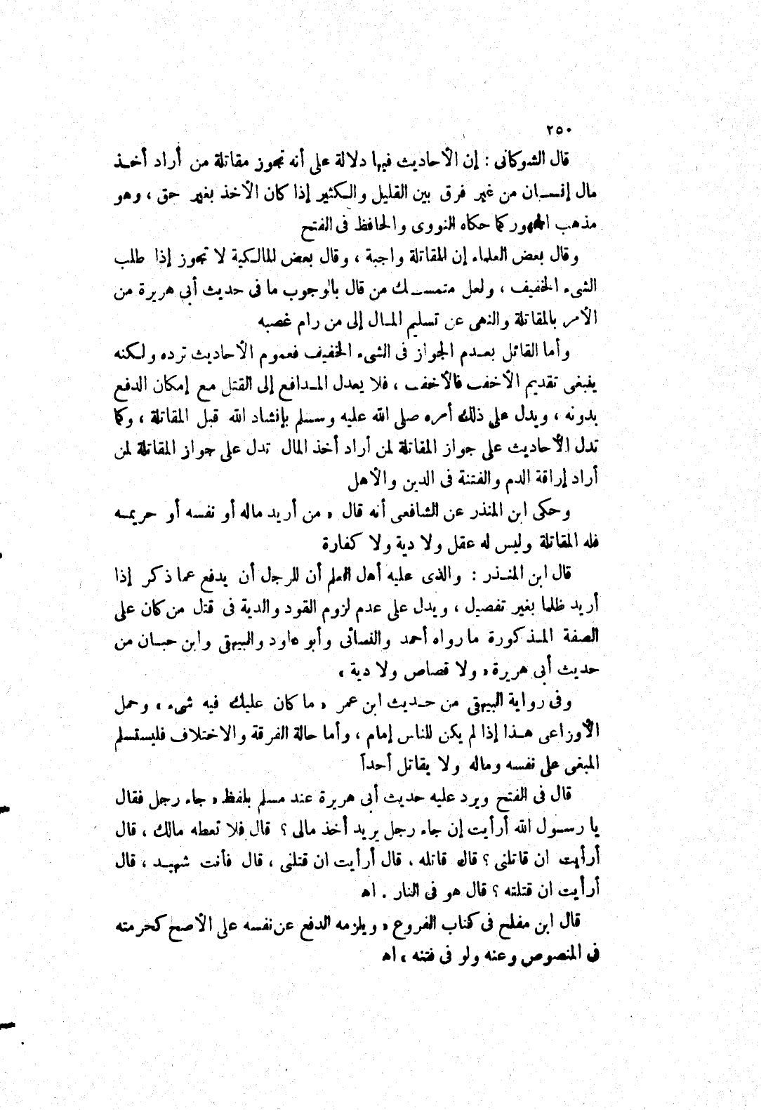 قال الشوكاني: إن الاحاديث فيها دلالة على أنه تجوز مقاتلة من أراد أخذ مال إنسان من غير فرق بين القليل والكثير إذا كان الاخذ بغير حق، وهو مذهب الجمهور كما حكاه النووي والحافظ في الفتح وقال بعض العلماء إن المقاتلة واجبة، وقال بعض المالكية لا تجوز إذا طلب الشئ الخفيف، ولعل متمسك من قال بالوجوب ما في حديث أبى هريرة من الامر بالمقاتلة والنهى عن تسليم المال إلى من رام غصبه وأما القائل بعدم الجواز في الشئ الخفيف فعموم الاحاديث ترده ولكنه ينبغى تقديم الاخف فالاخف، فلا يعدل المدافع إلى القتل مع إمكان الدفع بدونه، ويدل على ذلك أمره صلى الله عليه وسلم بإنشاد الله قبل المقاتلة، وكما تدل الاحاديث على جواز المقاتلة لمن أراد أخذ المال تدل على جواز المقاتلة لمن أراد إراقة الدم والفتنة في الدين والاهل