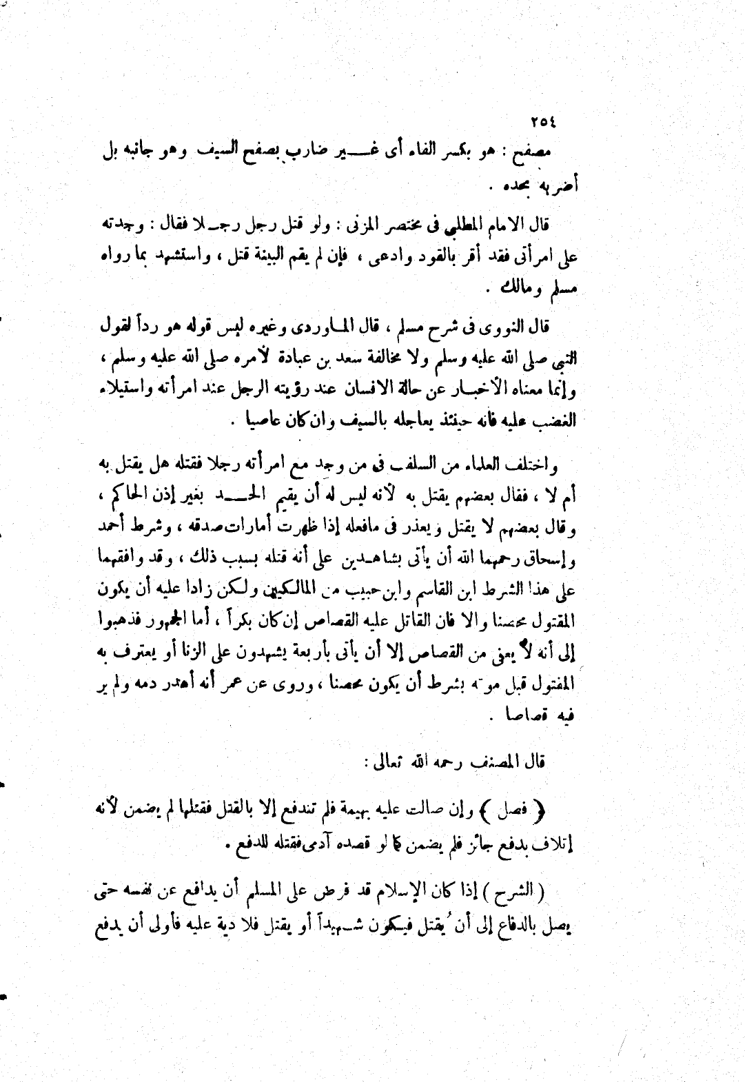 واختلف العلماء من السلف في من وجد مع امرأته رجلا فقتله هل يقتل به أم لا، فقال بعضهم يقتل به لانه ليس له أن يقيم الحد بغير إذن الحاكم، وقال بعضهم لا يقتل ويعذر في ما فعله إذا ظهرت أمارات صدقه، وشرط أحمد وإسحاق رحمهما الله أن يأتي بشاهدين على أنه قتله بسبب ذلك، وقد وافقهما على هذا الشرط ابن القاسم وابن حبيب من المالكيين ولكن زادا عليه أن يكون المقتول محصنا والا فان القاتل عليه القصاص إن كان بكرا، أما الجمهور فذهبوا إلى أنه لا يعفى من القصاص إلا أن يأتي بأربعة يشهدون على الزنا أو يعترف به المفتول قبل موته بشرط أن يكون محصنا، وروى عن عمر أنه أهدر دمه ولم ير فيه قصاصا.