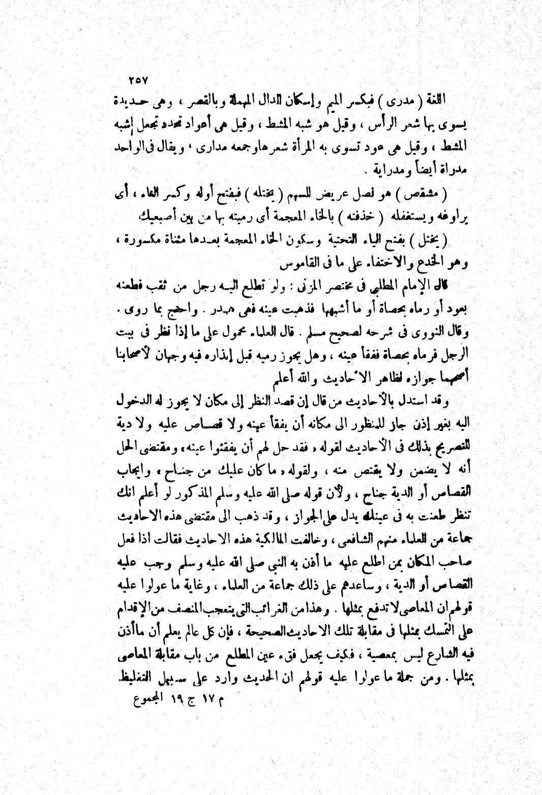 (مشقص) هو نصل عريض للسهم (يختله) فبفتح أوله وكسر التاء، أي يراوغه ويستغفله (خذفته) بالخاء المعجمة أي رميته بها من بين أصبعيك (يختل) بفتح الياء التحتية وسكون الخاء المعجمة بعدها مثناة مكسورة، وهو الخدع والاختفاء على ما في القاموس قال الامام المطلبى في مختصر المزني: ولو تطلع إليه رجل من ثقب فطعنه بعود أو رماه بحصاة أو ما أشبهها فذهبت عينه فهى هدر.
