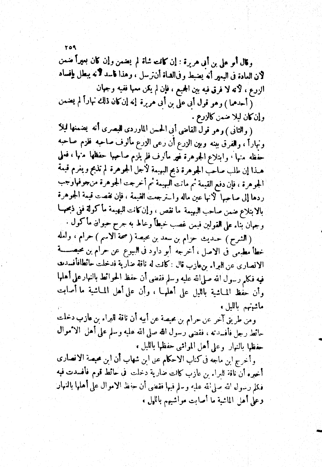 (الشرح) حديث حزام بن سعد بن محيصة (صحة الاسم) حرام، ولعله خطأ مطبعى في الاصل، أخرجه أبو داود في البيوع عن حرام بن محيصة الانصاري عن البراء بن عازب قال: كانت له ناقة ضارية فدخلت حائطا فأفسدت فيه فكلم رسول الله صلى الله عليه وسلم فقضى أن حفظ الحوائط بالنهار على أهلها وأن حفظ الماشية بالليل على أهلها، وأن على أهل الماشية ما أصابت ماشيتهم بالليل) ومن طريق آخر عن حرام بن محيصة عن أبيه أن ناقة البراء بن عازب دخلت حائط رجل فأفسدته، فقضى رَسُولِ اللَّهِ صَلَّى اللَّهُ عَلَيْهِ وَسَلَّمَ عَلَى أهل الاموال حفظها بالنهار وعلى أهل المواشى حفظها بالليل) وأخرج ابن ماجه في كتاب الاحكام عن ابن شهاب أن ابن محيصة الانصاري