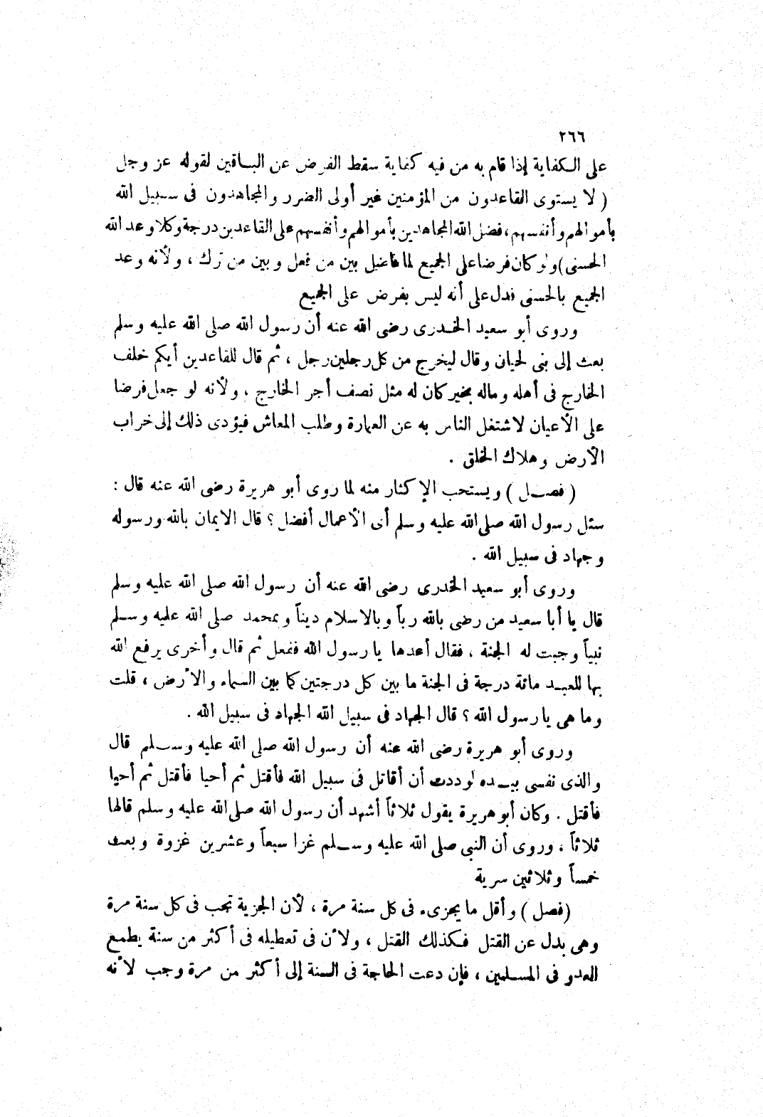 بأموالهم وأنفسهم، فضل الله المجاهدين بأموالهم وأنفسهم على القاعدين درجة وكلا وعد الله الحسنى) ولو كان فرضا على الجميع لما فاضل بين من فعل وبين من ترك، ولانه وعد الجميع بالحسنى فدل على أنه ليس بفرض على الجميع وروى أَبُو سَعِيدٍ الْخُدْرِيُّ رَضِيَ اللَّهُ عَنْهُ أَنَّ رَسُولَ اللَّهِ صَلَّى اللَّهُ عَلَيْهِ وَسَلَّمَ بَعَثَ إلى بنى لحيان وقال ليخرج من كل رجلين رجل، ثم قال للقاعدين أيكم خلف الخارج في أهله وماله بخير كان له مثل نصف أجر الخارج، ولانه لو جعل فرضا على الاعيان لاشتغل الناس به عن العمارة وطلب المعاش فيؤدى ذلك إلى خراب الارض وهلاك الخلق.