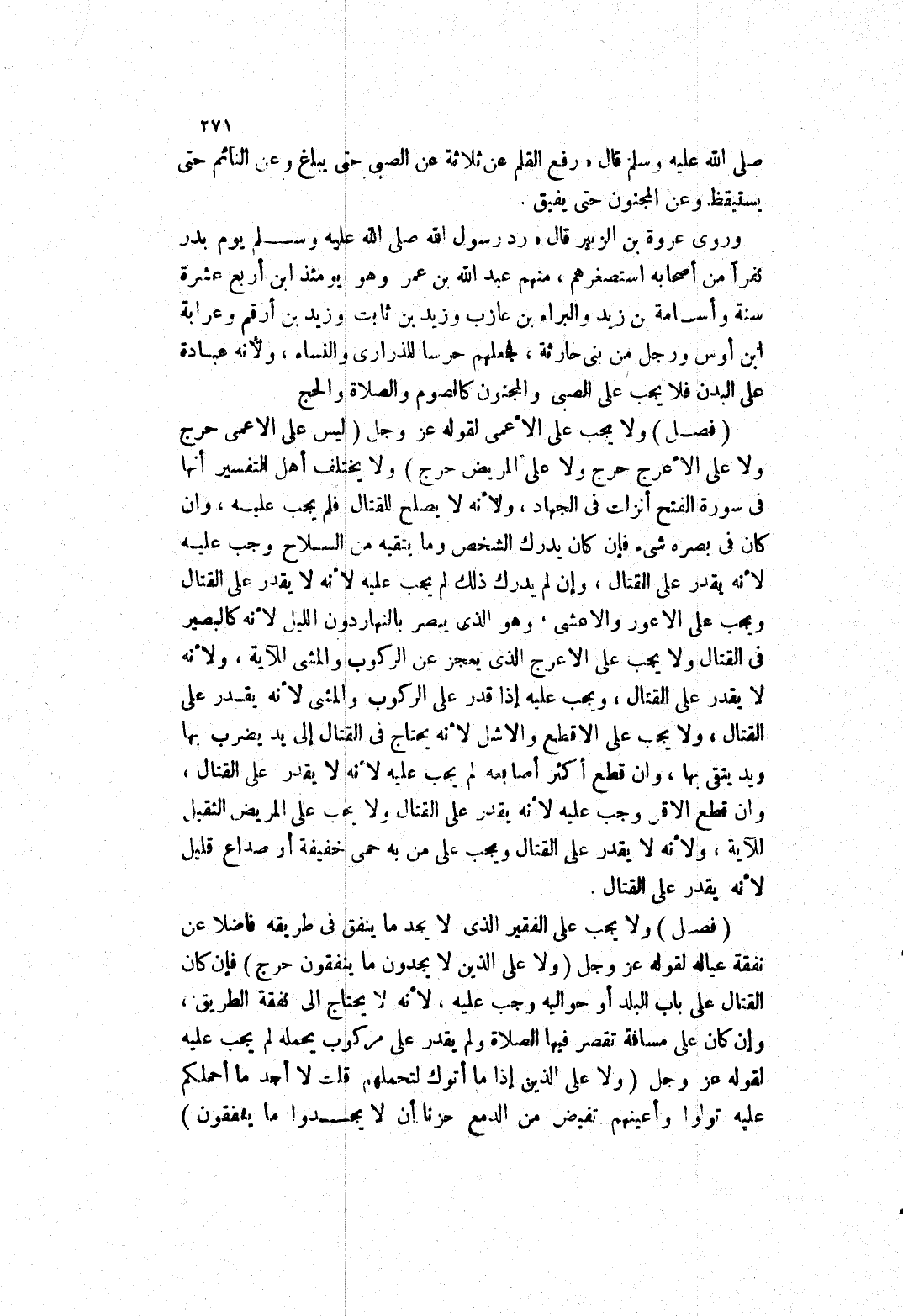 وروى عروة بن الزبير قال (رد رَسُولَ اللَّهِ صَلَّى اللَّهُ عَلَيْهِ وَسَلَّمَ يَوْمَ بدر كفرا من أصحابه استصغرهم، منهم عبد الله بن عمر وهو يومئذ ابن أربع عشرة سنة وأسامة بن زيد والبراء بن ازب وزيد بن ثابت وزيدبن أرقم وعرابة ابن أوس ورجل من بنى حارثة، فجعلهم حرسا للذراري والنساء، ولانه عبادة على البدن فلا يجب على الصبى والمجنون كالصوم والصلاة والحج