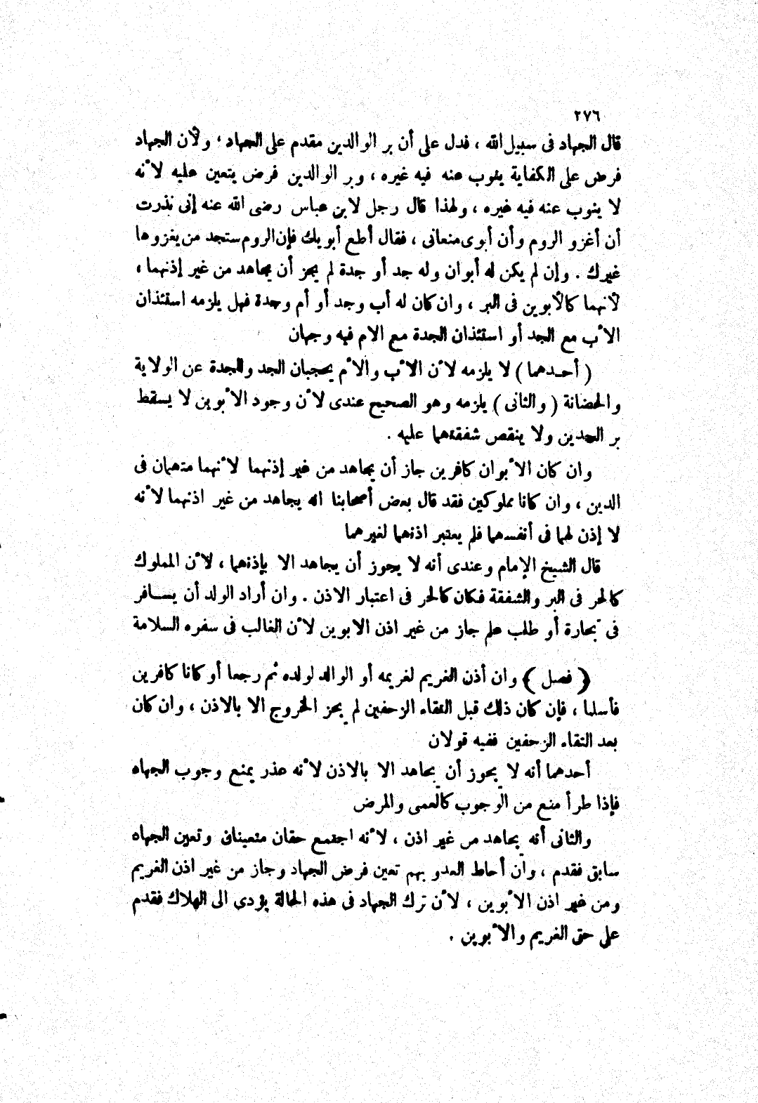 وان كان الابوان كافرين جاز أن يجاهد من غير إذنهما لانهما متهمان في الدين، وان كانا مملوكين فقد قال بعض أصحابنا أنه يجاهد من غير اذنهما لانه لا إذن لهما في أنفسهما فلم يعتبر اذنهما لغيرهما قال الشيخ الامام وعندي أنه لا يجوز أن يجاهد الا بإذنهما، لان المملوك كالحر في البر والشفقة فكان كالحر في اعتبار الاذن.