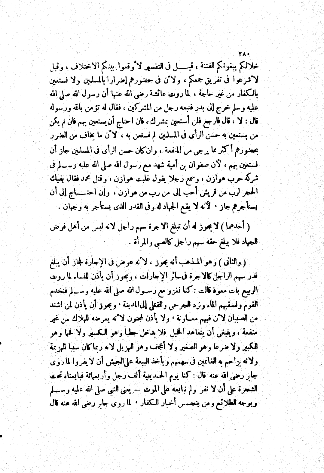 خلالكم يبغونكم الفتنة) قيل في التفسير لاوقعوا بينكم الاختلاف، وقيل لا شرعوا في تفريق جمعكم، ولان في حضورهم إضرار بالمسلمين ولا نستعين بالكفار من غير حاجة، لِمَا رَوَتْ عَائِشَةُ رَضِيَ اللَّهُ عَنْهَا أَنَّ رَسُولَ اللَّهِ صلى الله عليه وسلم خرج إلى بدر فتبعه رجل من المشركين، فقال له تؤمن بالله ورسوله قال: لا، قال فارجع فلن أستعين بمشرك، فان احتاج أن يستعين بهم فان لم يكن من يستعين به حسن الرأى في المسلمين لم نستعن به، لان ما يخاف من الضرر بحضورهم أكثر مما يرجى من النفعة، وان كان حسن الرأى في المسلمين جاز أن نستعين بهم، لان صفوان بن أمية شَهِدَ مَعَ رَسُولِ اللَّهِ صَلَّى اللَّهُ عَلَيْهِ وَسَلَّمَ في شركه حرب هوازن، وسمع رجلا يقول غلبت هوازن، وقتل محمد فقال بفيك الحجر لرب من قريش أحب إلى من رب من هوازن، وإن احتاج إلى أن يستأجرهم جاز، لانه لا يقع الجهاد له وفى القدر الذى يستأجر به وجهان.