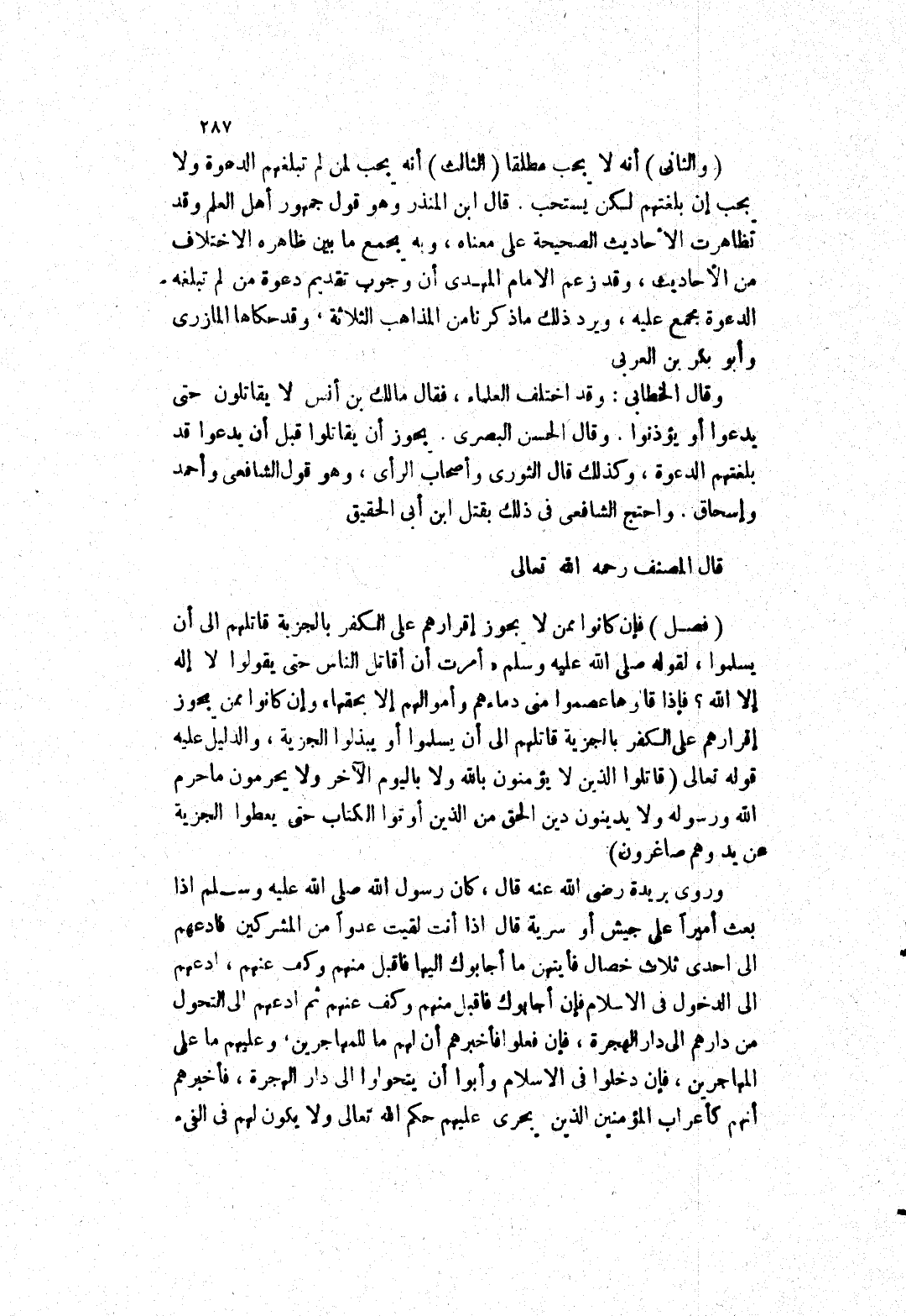 فإن كانوا ممن لا يجوز إقرارهم على الكفر بالجزية قاتلهم إلى أن يسلموا، لقوله صلى الله عليه وسلم (أمرت أن أقاتل الناس حتى يقولوا لا إله إلا الله؟ فإذا قالوها عصموا منى دماءهم وأموالهم إلا بحقها) وإن كانوا ممن يجوز إقرارهم على الكفر بالجزية قاتلهم إلى أن يسلموا أن يبذلوا الجزية، والدليل عليه قوله تعالى (قاتلوا الذين لا يؤمنون بالله ولا باليوم الآخر ولا يحرمون ما حرم الله ورسوله ولا يدينون دين الحق من الذين أوتوا الكتاب حتى يعطوا الجزية عن يدوهم صاغرون) وروى بريدة رَضِيَ اللَّهُ عَنْهُ قَالَ، كَانَ رَسُولُ اللَّهِ صَلَّى اللَّهُ عَلَيْهِ وسلم إذا بعث أميرا على جيش أو سرية قال إذا أنت لقيت عدوا من المشركين فادعهم إلى احدى ثلاث خصال فأيتهن ما أجابوك إليها فاقبل منهم وكف عنهم، ادعهم إلى الدخول في الاسلام فإن أجابوك فاقبل منهم وكف عنهم ثم ادعهم إلى التحول من دارهم إلى دار الهجرة، فإن فعلوا فأخبرهم أن لهم ما للمهاجرين، وعليهم ما على المهاجرين، فإن دخلوا في الاسلام وأبوا أن يتحولوا لالى دار الهجرة، فأخبرهم أنهم كاعراب المؤمنين الذين يجرى عليه حكم الله تعالى ولا يكون لهم في الفئ