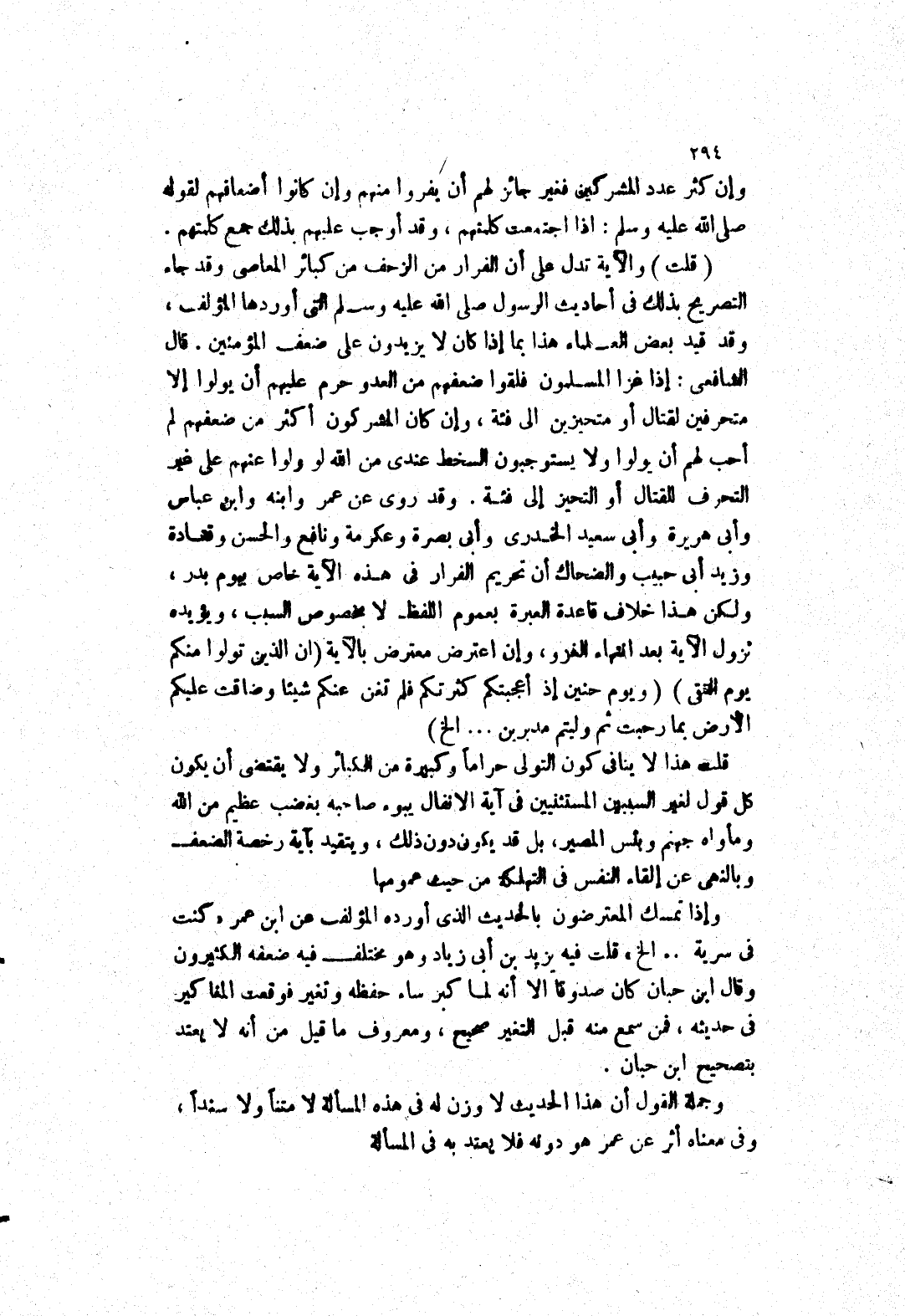 وقد روى عنه عمر وابنه وَابْنِ عَبَّاسٍ وَأَبِي هُرَيْرَةَ وَأَبِي سَعِيدٍ الْخُدْرِيِّ وأبى بصرة وعكرمة ونافع والحسن وقتادة وزيد أبى حبيب والضحاك أن تحريم الفرار في هذه الآية خاص بيوم بدر، ولكن هذا خلاف قاعدة العبرة بعموم اللفظ لا بخصوص السبب، ويؤيده نزول الآية بعد انتهاء الغزو، وإن اعترض معترض بالآية (ان الذين تولوا منكم يوم التقى) (ويوم حنين إذ أعجبتكم كثرتكم فلم تغن عنكم شيئا وضاقت عليكم الارض بما رحبت ثم وليتم مدبرين..الخ) قلت هذا لا ينافى كون التولى حراما وكبيرة من الكبائر ولا يقتضى أن يكون كل قول لغير السببين المستثنيين في آية الانفال يبوء صاحبه بغضب عظيم من الله