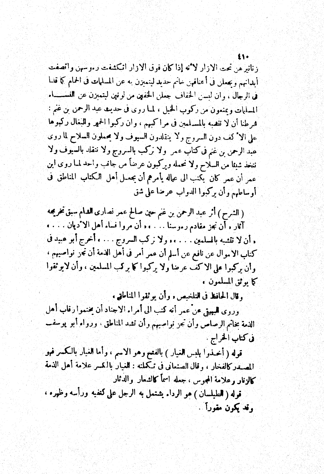 زنانير هن تحت الازار لانه إذا كان فوق الازار انكشفت رؤوسهن واتصفت أبدانهم ويجعلن في أعناقهن خاتم حديد ليتميزن به عن المسلمات في الحمام كما قلنا في الرجال، وان لبسن الخفاف جعلن الخفين من لوقين ليتميزن عن النساء المسلمات ويمنعون من ركوب الخيل، لما روى في حديث عبد الرحمن بن غنم: شرطنا أن لا نتشبه بالمسلمين في مراكبهم، وان ركبوا الحمير والبغال ركبوها على الاكف دون السروج ولا يتقلدون السيوف ولا يحملون السلاح لما روى عبد الرحمن بن غنم في كتاب عمر ولا تركب بالسروج ولا نتقلد بالسيوف ولا نتخذ شيئا من السلاح ولا نحمله ويركبون عرضا من جانب واحد لما روى ابن عمر أن مر كان يكتب إلى عماله يأمرهم أن يجعل أهل الكتاب المناطق في أوساطهم وأن يركبوا الدواب عرضا على شق (الشرح) أثر عبد الرحمن بن غنم حين صالح عمر نصارى الشام سبق تخريجه آثار (أن نجز مقادم رؤوسنا..) أن مروا نساء أهل الاديان..) (أن لا نتشبه بالمسلمين..) (ولا نركب السروج..) أخرج أبو عبيد في كتاب الاموال عن نافع عن أسلم أن عمر أم ر في أهل الذمة أن تجز نواصيهم، وأن يركبوا على الاكف عرضا ولا يركبوا كما يركب المسلمين، وأن لا يوثقوا كما يوثق المسلمون) وقال الحافظ في التلخيص (وأن يوثقوا المناطق) وروى البيهقى عن عمر أنه كتب إلى أمراء الاجناد أن يختموا رقاب أهل الذمة بخاتم الرصاص وأن تجز نواصيهم وأن تشد المناطق، ورواه أبو يوسف في كتاب الخراج.