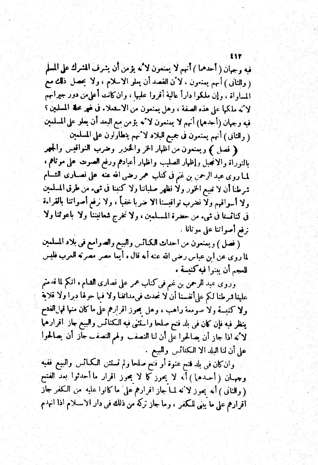 للعجم أن يبنوا فيه كنيسة) وروى عبد الرحمن بن غنم في كتاب عمر على نصارى الشام (انكم لما قدمتم عليا شرطنا لكم على أنفسنا أن لا نحدث في مدائننا ولا فيما حولها دبرا ولا قلاية ولا كنيسة ولا صومعة راهب، وهل يجوز اقرارهم على ما كان منها قبل الفتح ينظر فيه فإن كان في بلد فتح صلحا واستثنى فيه الكنائس والبيع جاز اقرارهما لانه إذا جاز أن يصالحوا على أن لنا النصف ولهم النصف جاز أن يصالحوا على أن لنا البلد الا الكنائس والبيع.