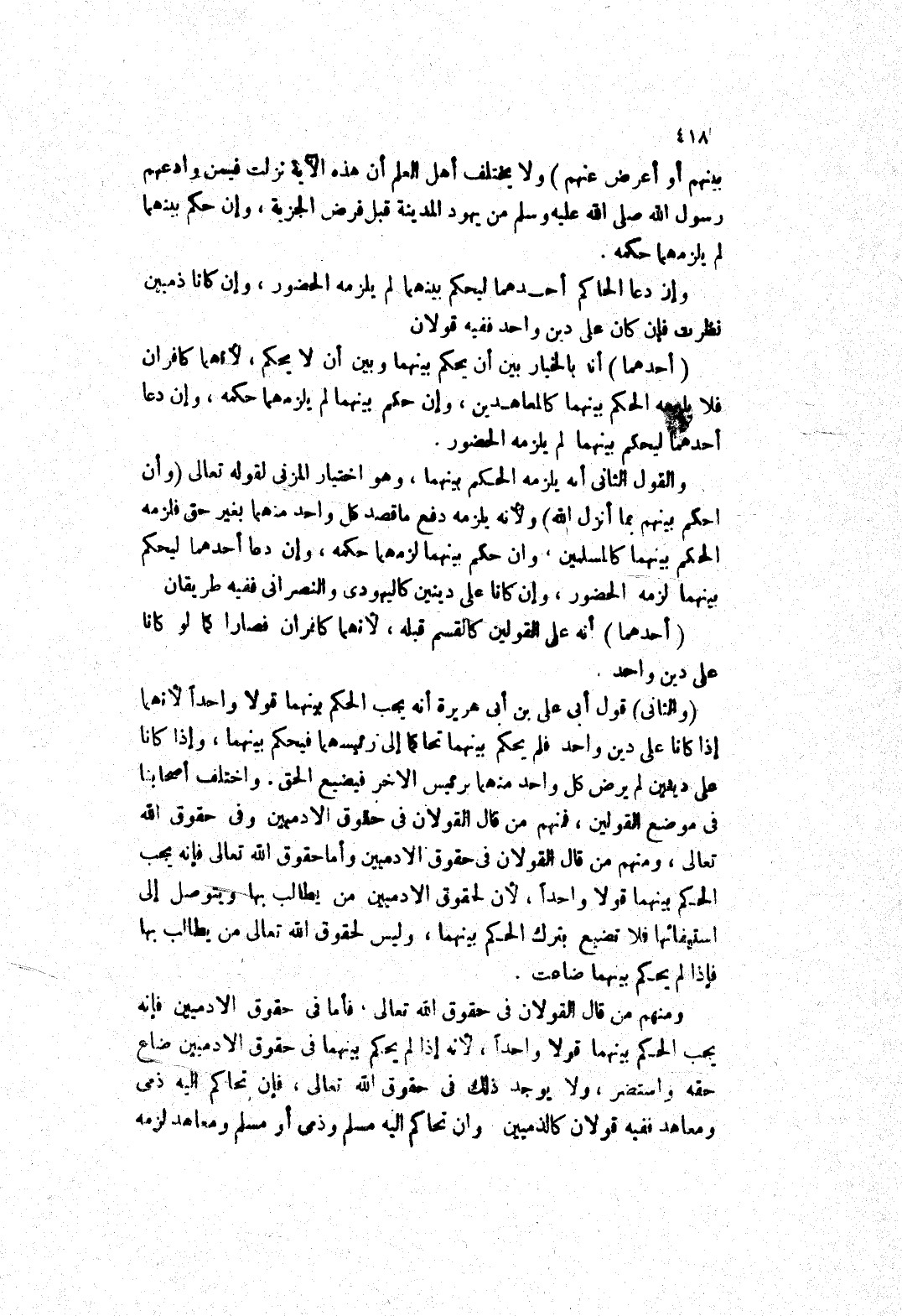 ومنهم من قال القولان في حقوق الله تعالى فأما في حقوق الادميين فإنه يجب الحكم بينهما قولا واحدا، لانه إذا لم يحكم بينهما في حقوق الادميين ضاع حقه واستضر، ولا يوجد ذلك في حقوق الله تعالى، فإن تحاكم إليه ذمى ومعاهد ففيه قولان كالذميين وان تحاكم إليه مسلم وذمى أو مسلم ومعاهد لزمه