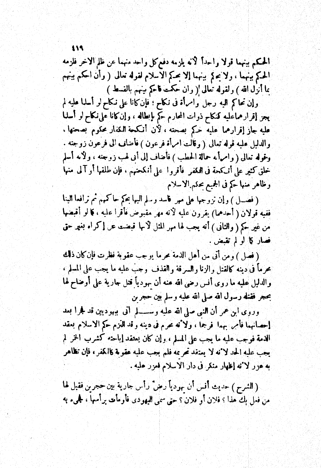 ومن أتى من أهل الذمة محرما يوجب عقوبة نظرت فإن كان ذلك محرما في دينه كالقتل والزنا والسرقة والقذف وجب عليه ما يجب على المسلم، والدليل عليه ماروى أنس رضى الله عنه أن يهوديا قتل جارية على أوضاح لها بحجر فقتله رَسُولُ اللَّهِ صَلَّى اللَّهُ عَلَيْهِ وَسَلَّمَ بَيْنَ حجرين.