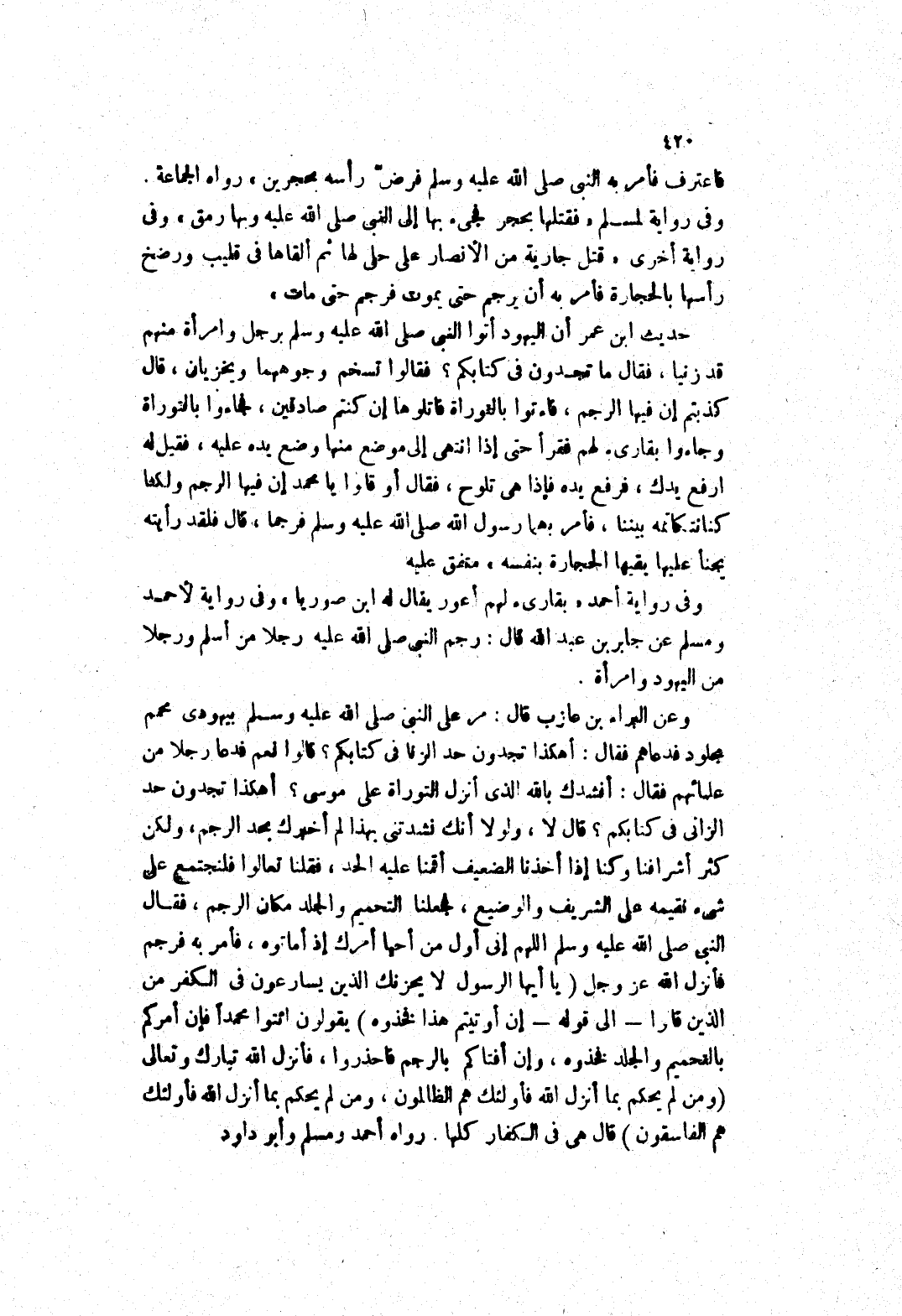 رأسها بالحجارة فأمر به أن يرجم حتى يموت فرجم حتى مات) حديث ابن عمر أن اليهود أتوا النبي صلى الله عليه وسلم رجل وامرأة منهم قد زنيا، فقال ما تجدون في كتابكم؟ فقالا تسخم وجوههما ويخزيان، قال كذبتم إن فيها الرجم، فاءتوا بالتوراة فاتلوها إن كنتم صادقين، فجاءوا بالتوراة وجاءوا بقارئ لهم فقرأ حتى إذا انتهى إلى موضع منها وضع يده عليه، فقيل له ارفع يدك، فرفع يده فإذا هي تلوح، فقال أو قالوا يا محمد إن فيها الرجم ولكنا كنانت كاتمه بيننا، فأمر بهما رسول الله صلى الله عليه وسلم فرجما، قال فلقد رأيته يجنا عليها يقبها الحجارة بنفسه) متفق عليه وفى رواية أخرى (بقارئ لهم أعور يقال له ابن صوريا) وفى رواية لاحمد ومسلم عن جابر بن عبد الله قال: رجم النبي صلى الله عليه وسلم من أسلم ورجلا من اليهود وامرأة.
