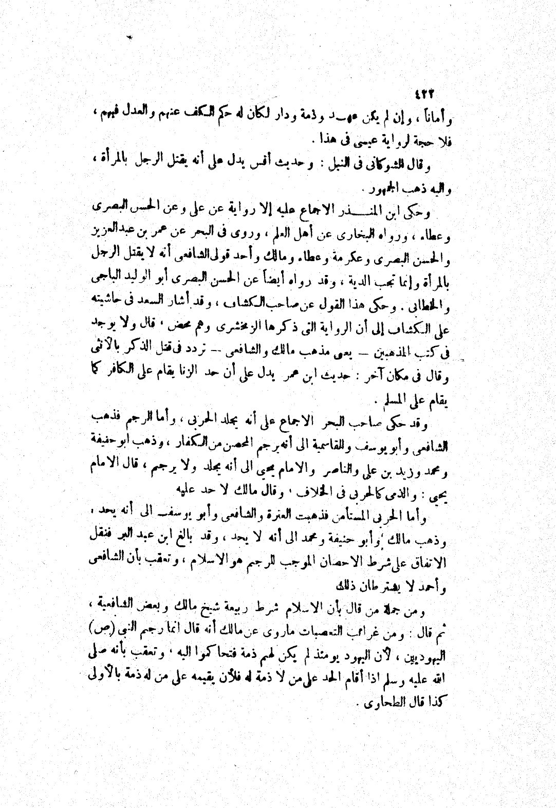 وحكى هذا القول عن صاحب الكشاف، وقد أشار السعد في حاشيته على الكشاف إلى أن الرواية التى ذكرها الزمخشري وهم محض، قال ولا يوجد في كتب المذهبين يعنى مذهب مالك والشافعي تردد في قتل الذكر بالانثى وقال في مكان آخر: حديث ابن عمر يدل على أن حد الزنا يقام على الكافر كما يقام على المسلم.