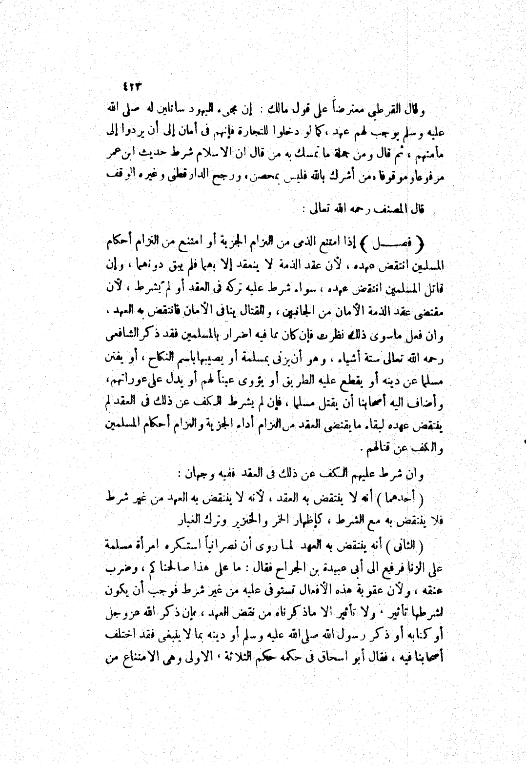 أن هـ لا ينتقض به العقد، لانه لا ينتقض به العهد من غير شرط فلا ينتقض به مع الشرط، كإظهار الخمر والخنزير وترك الغيار (الثاني) أنه ينتقض به العهد لما روى أن نصرانيا استكره امرأة مسلمة على الزنا فرفع إلى أبى عبيدة بن الجراح فقال: ما على هذا صالحنا كم، وضرب عنقه، ولان عقوبة هذه الافعال تستوفى عليه من غير شرط فوجب أن يكون لشرطها تأثير، ولا تأثير الاما ذكرناه من نقض العهد، فإن ذكر الله عز وجل أو كتابه أو ذَكَرَ رَسُولِ اللَّهِ صَلَّى اللَّهُ عَلَيْهِ وَسَلَّمَ أَوْ دينه بما لا ينبغى فقد اختلف أصحابنا فيه، فقال أبو إسحاق في حكمه حكم الثلاثة، الاولى وهى الامتناع من
