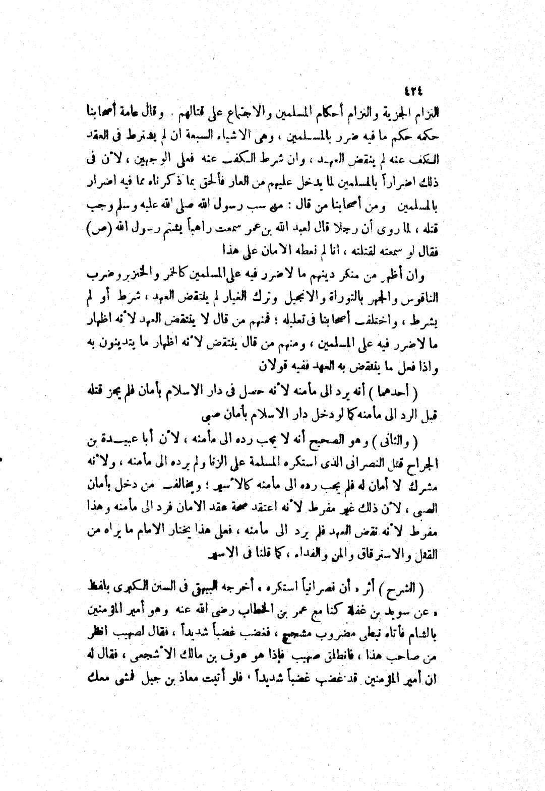 التزام الجزية والتزام أحكام المسلمين والاجتماع على قتالهم، وقال عامة أصحابنا حكمه حكم ما فيه ضرر بالمسلمين، وهى الاشياء السبعة ان لم يشترط في العقد الكف عنه لم ينقض العهد، وان شرط الكف عنه فعلى الوجهين، لان في ذلك اضرارا بالمسلمين لما يدخل عليهم من العار فألحق بما ذكرناه مما فيه اضرار بالمسلمين ومن أصحابنا من قال: من سب رسول الله صلى الله عليه وسلم وجب قتله، لما روى أن رجلا قال لعبد الله بن عمر سمعت راهبا يشتم رَسُولِ اللَّهِ صَلَّى اللَّهُ عَلَيْهِ وَسَلَّمَ فَقَالَ لو سمعته لقتلته، انا لم نعطه الامان على هذا وان أظهر من منكر دينهم ما لاضرر فيه على المسلمين كالخمر والخنزير وضرب