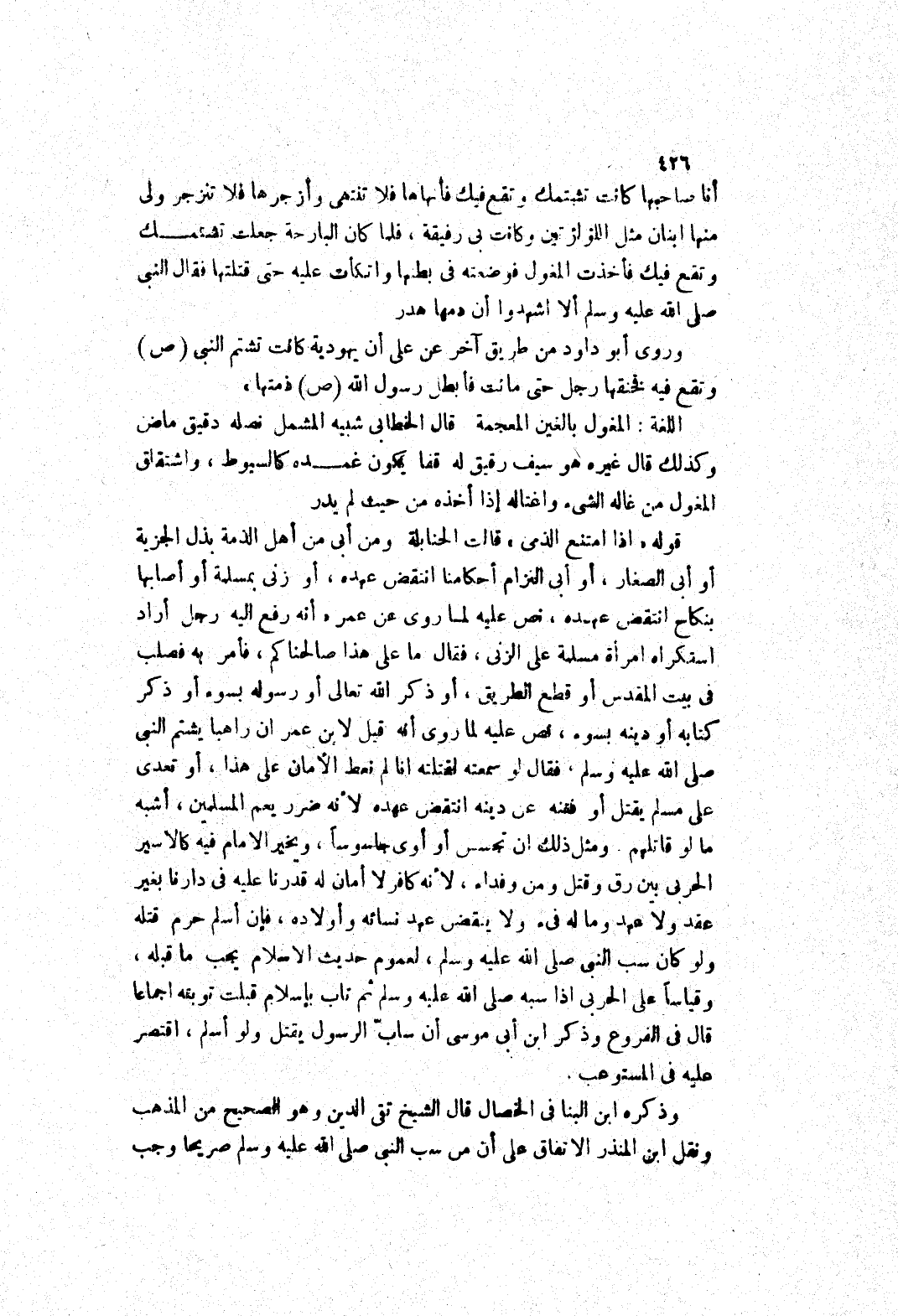 أنا صاحبها كانت تشتمك وتقع فيك فأنها ها فلا تنهى وأزجرها فلا تنزجر ولى منها ابنان مثل اللؤلؤتين وكانت بى رفيقة، فلما كان البارحة جعلت تشتمك وتقع فيك فأخذت المغول فوضعته في بطنها واتكأت عليه حتى قتلتها فقال النبي صلى الله عليه وسلم ألا اشهدوا أن دمها هدر وروى أبو داود من طريق آخر عن على أن يهودية كانت تشتم النبي صلى الله عليه وسلم وتقع فيه فخنقها رجل حتى ماتت فأبطل رسول الله صلى الله عليه وسلم ذمتها) اللغة: المغول بالغين المعجمة قال الخطابى شبيه المشمل نصله دقيق ماضن وكذلك قال غيره هو سيف رقيق له قفا يكون غمده كالسيوط، واشتقاق المغول من غاله الشئ واغتاله إذا أخذه من حيث لم يدر قوله (إذا امتنع الذمي) قالت الحنابلة ومن أبى من أهل الذمة بذل الجزية أو أبى الصغار، أو أبى التزام أحكامنا انتقض عهده، أو زنى بمسلمة أو أصابها بنكاح انتقض عهده، نص عليه لما روى عن عمر (أنه رفع إليه رجل أراد استكراه امرأة مسلمة على الزنى، فقال ما على هذا صالحناكم، فأمر به فصلب في بيت المقدس أو قطع الطريق، أو ذكره الله تعالى أو رسوله بسوء أو ذكر كتابه أو دينه بسوء، نص عليه لما روى أنه قيل لابن عمران راهبا يشتم النَّبِيَّ صَلَّى اللَّهُ عَلَيْهِ وَسَلَّمَ فَقَالَ لَوْ سمعته لقتلته انا لم نعط الامان على هذا، أو تعدى على مسلم يقتل أو فتنه عن دينه انتقض عهده لانه ضرر يعم المسلمين، أشبه مالو قاتلهم.