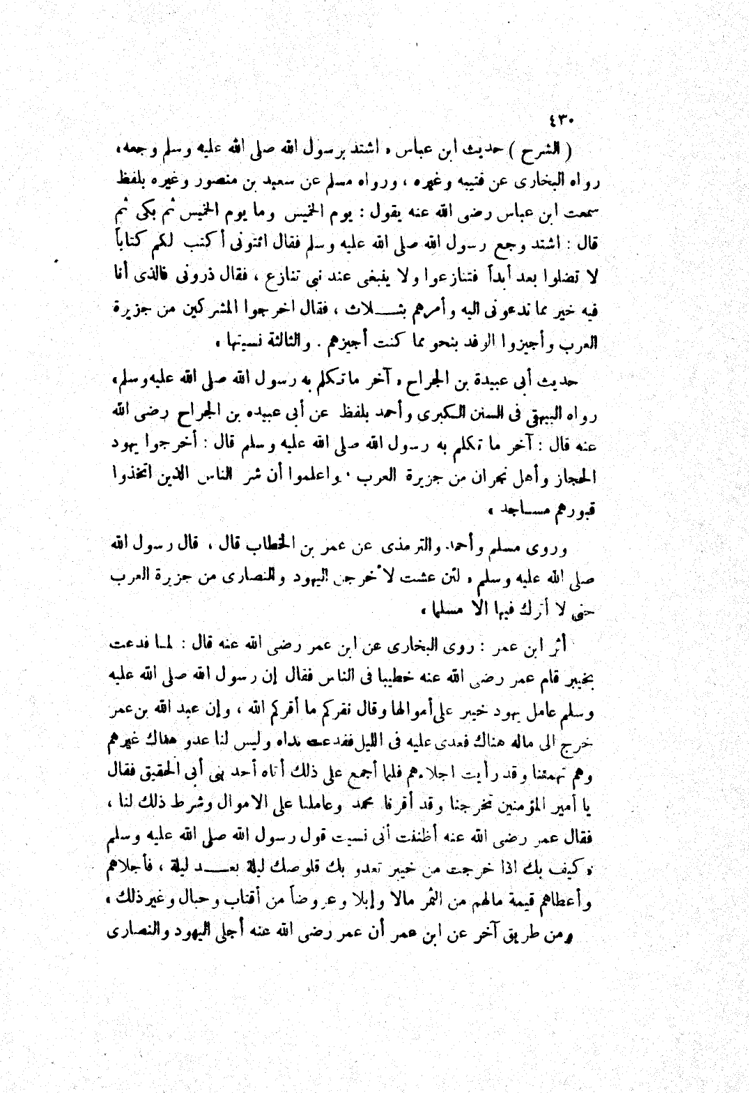 والثالثة نسيتها) حديث أبى عبيدة بن الجراح (آخر ما تكلم بِهِ رَسُولُ اللَّهِ صَلَّى اللَّهُ عَلَيْهِ وَسَلَّمَ) رواه البيهقى في السنن الكبرى وأحمد بلفظ عن أبى عبيدة بن الجراح رضى الله عنه قال: آخر ما تكلم بِهِ رَسُولُ اللَّهِ صَلَّى اللَّهُ عَلَيْهِ وَسَلَّمَ قَالَ: أخرجوا يهود الحجاز وأهل نجران من جزيرة العرب، واعلموا أن شر الناس الذين اتخذوا قبورهم مساجد) وروى مسلم وأحمد والترمذي عن عمر بن الخطاب قَالَ، قَالَ رَسُولُ اللَّهِ صَلَّى اللَّهُ عَلَيْهِ وسلم (لئن عشت لاخرجن اليهود والنصارى من جزيرة العرب حتى لا أترك فيها الا مسلما) أثر ابن عمر: روى البخاري عَنْ ابْنِ عُمَرَ رَضِيَ اللَّهُ عَنْهُ قَالَ: لما فدعت بخيبر قام عمر رضى الله عنه خطيبا في الناس فَقَالَ أَنَّ رَسُولَ اللَّهِ صَلَّى اللَّهُ عَلَيْهِ وَسَلَّمَ عامل يهود خيبر على أموالها وقال نقركم ما أقركم الهل، وإن عبد الله بن عمر خرج إلى ماله هناك فعدى عليه في الليل ففدعت بداه وليس لنا عدو هناك غيرهم وهم تهمئنا وقد رايت اجلاءهم فلما أجمع على ذلك أتاه أحد بنى أبى الحقيق فقال يا أمير المؤمنين تخرجنا وقد أقرنا محمد وعاملنا على الاموال وشرط ذلك لنا، فقال عمر رضى الله عنه أظننت أنى نسيت قَوْلُ رَسُولِ اللَّهِ صَلَّى اللَّهُ عَلَيْهِ وَسَلَّمَ (كَيْفَ بك إذا خرجت من خيبر تعدو بك قلو صك ليلة بعد ليلة، فأجلاهم وأعطاهم قيمة مالهم من الثمر مالا وإبلا وعروضا من أقتاب وحبال وغير ذلك) ومن طريق آخر عن ابن عمر أن عمر رضى الله عنه أجلى اليهود والنصارى