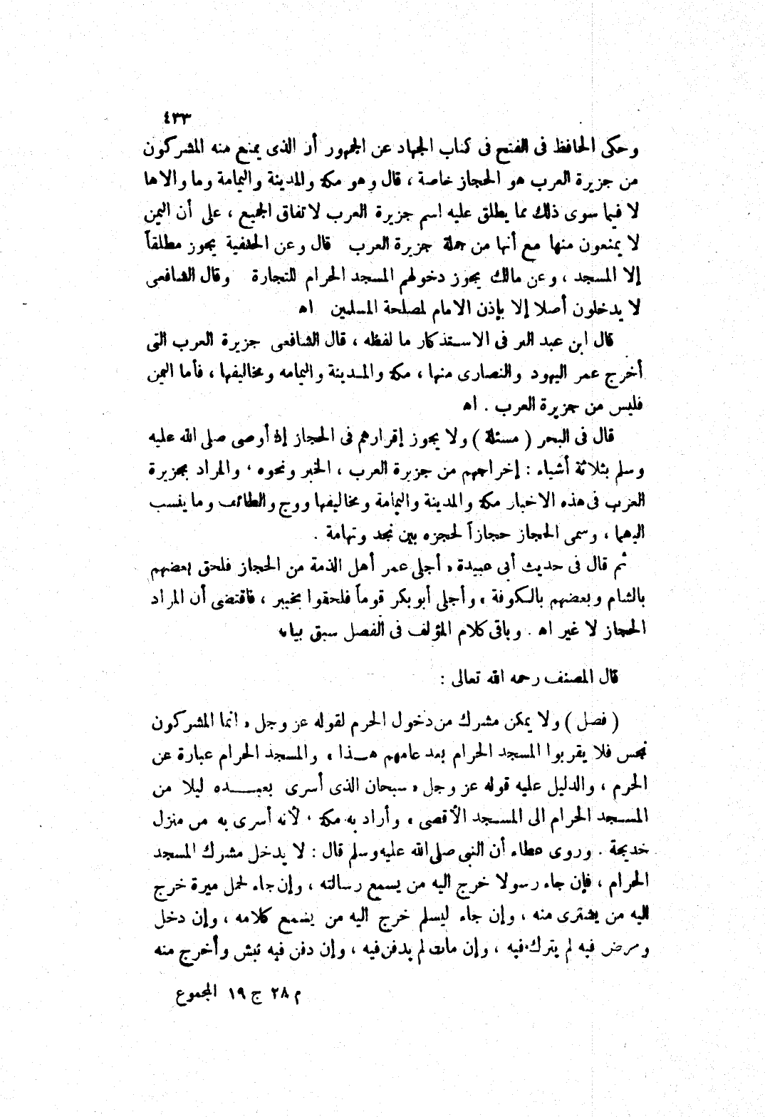 وحكى الحافظ في الفتح في كتاب الجهاد عن الجمهور أن الذى يمنع منه المشركون من جزيرة العرب هو الحجاز خاصة، قال وهو مكة والمدينة واليمامة وما والاها لا فيما سوى ذلك مما يطلق عليه اسم جزيرة العرب لاتفاق الجميع، على أن اليمن لا يمنعون منها مع أنها من جملة جزيرة العرب قال وعن الحنفية يجوز مطلقا إلا المسجد، وعن مالك يجوز دخولهم المسجدا لحرام للتجارة وقال الشافعي لا يدخلون أصلا إلا بإذن الامام لمصلحة المسلمين اه قال ابن عبد البر في الاستذكار ما لفظه، قال الشافعي جزيرة العرب التى أخرج عمر اليهود والنصارى منها، مكة والمدينة واليمامه ومخاليفها، فأما اليمن فليس من جزيرة العرب.