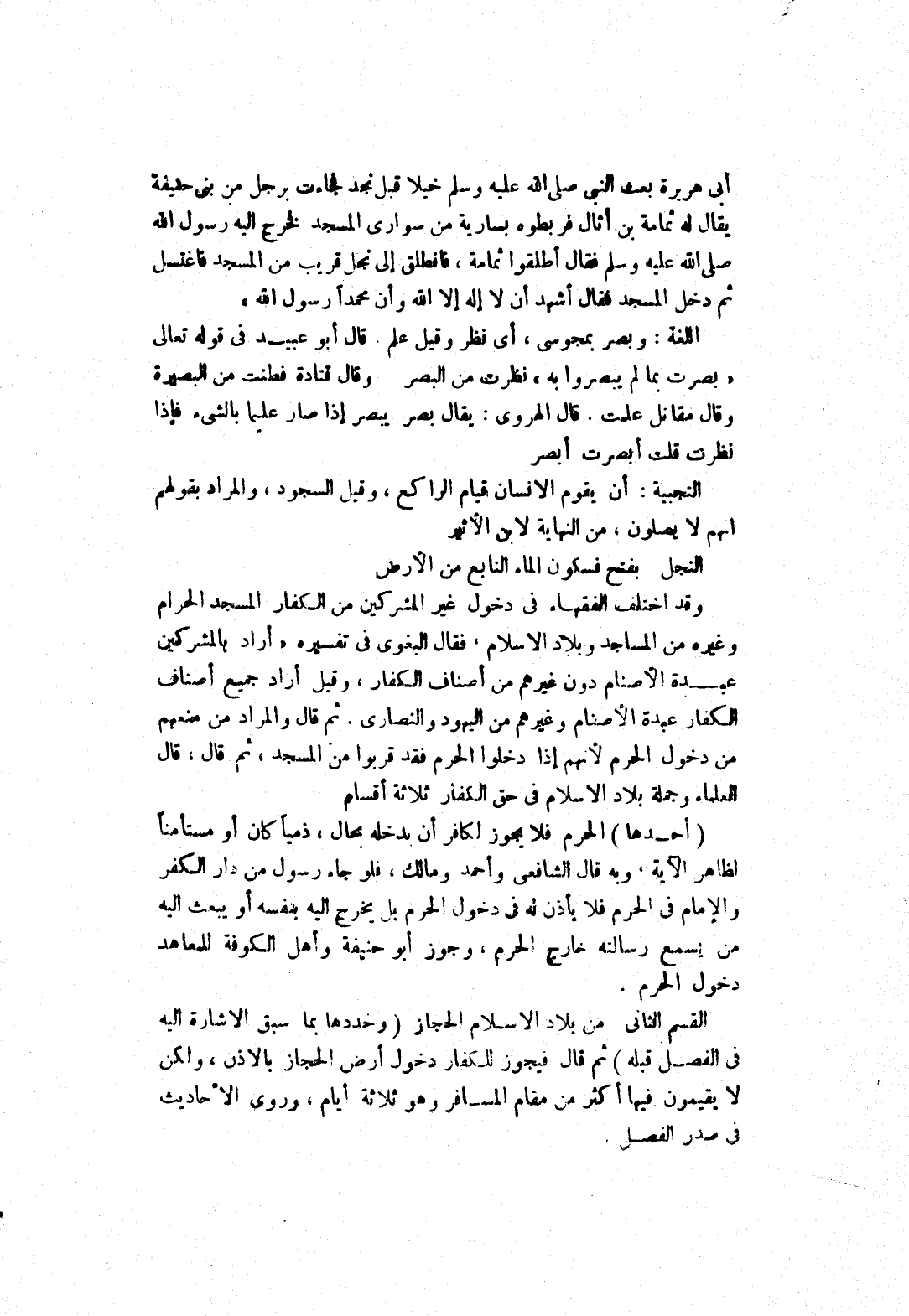 قال الهروي: يقال بصر يبصر إذا صار عليما بالشئ فإذا نظرت قلت أبصرت أبصر التجبية: أن يقوم الانسان قيام الراكع، وقيل السجود، والمراد بقولهم انهم لا يصلون، من النهاية لابن الاثير النجل بفتح فسكون الماء النابع من الارض وقد اختلف الفقهاء في دخول غير المشركين من الكفار المسجد الحرام وغيره من المساجد وبلاد الاسلام، فقال البغوي في تفسيره (أراد بالمشركين عبدة الاصنام دون غيرهم من أصناف الكفار، وقيل أراد جميع أصناف الكفار عبدة الاصنام وغيرهم من اليهود والنصارى.