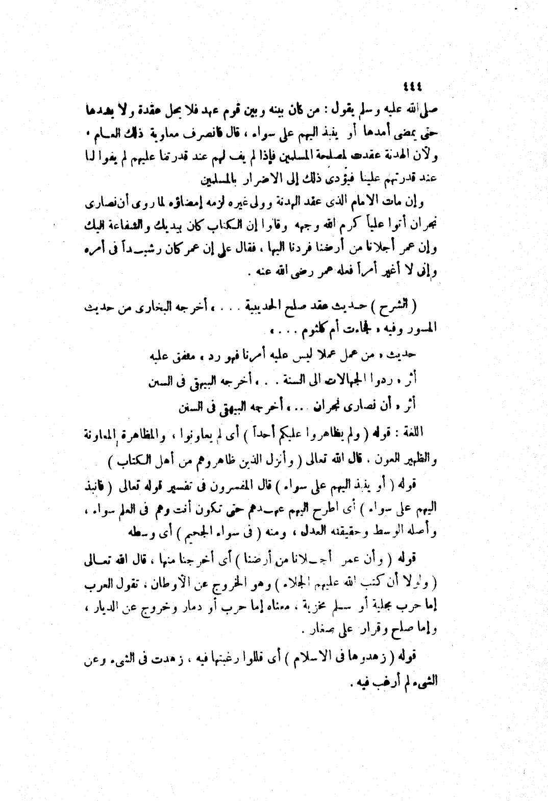 (الشرح) حديث عقد صلح الحديبية..) أخرجه البخاري من حديث المسور وفيه (فجاءت أم كلثوم..) حديث (مَنْ عَمِلَ عَمَلًا لَيْسَ عَلَيْهِ أَمْرُنَا فَهُوَ رد) متفق عليه أثر (ردوا الجهالات إلى السنة..) أخرجه البيهقى في السنن أثر (أن نصارى نجران..) أخرجه البيهقى في السنن اللغة: قوله (ولم يظاهروا عليكم أحدا) أي لم يعاونوا، والمظاهرة المعاونة والظهير العون، قال الله تعالى (وأنزل الذين ظاهروهم من أهل الكتاب) قوله (أو ينبذ إليهم على سواء) قال المفسرون في تفسير قوله تعالى (فانبذ إليهم على سواء) أي اطرح إليهم عهدهم حتى تكون أنت وهم في العلم سواء، وأصله الوسط وحقيقته العدل، ومنه (في سواء الجحيم) أي وسطه قوله (وأن عمر أجلانا من أرضنا) أي أخرجنا منها، قال الله تعالى (ولولا أن كتب الله عليهم الجلاء) وهو الخروج عن الاوطان، تقول العرب إما حرب مجلية أو سلم مخزية، معناه إما حرب أو دمار وخروج عن الديار، وإما صلح وقرار على صغار.