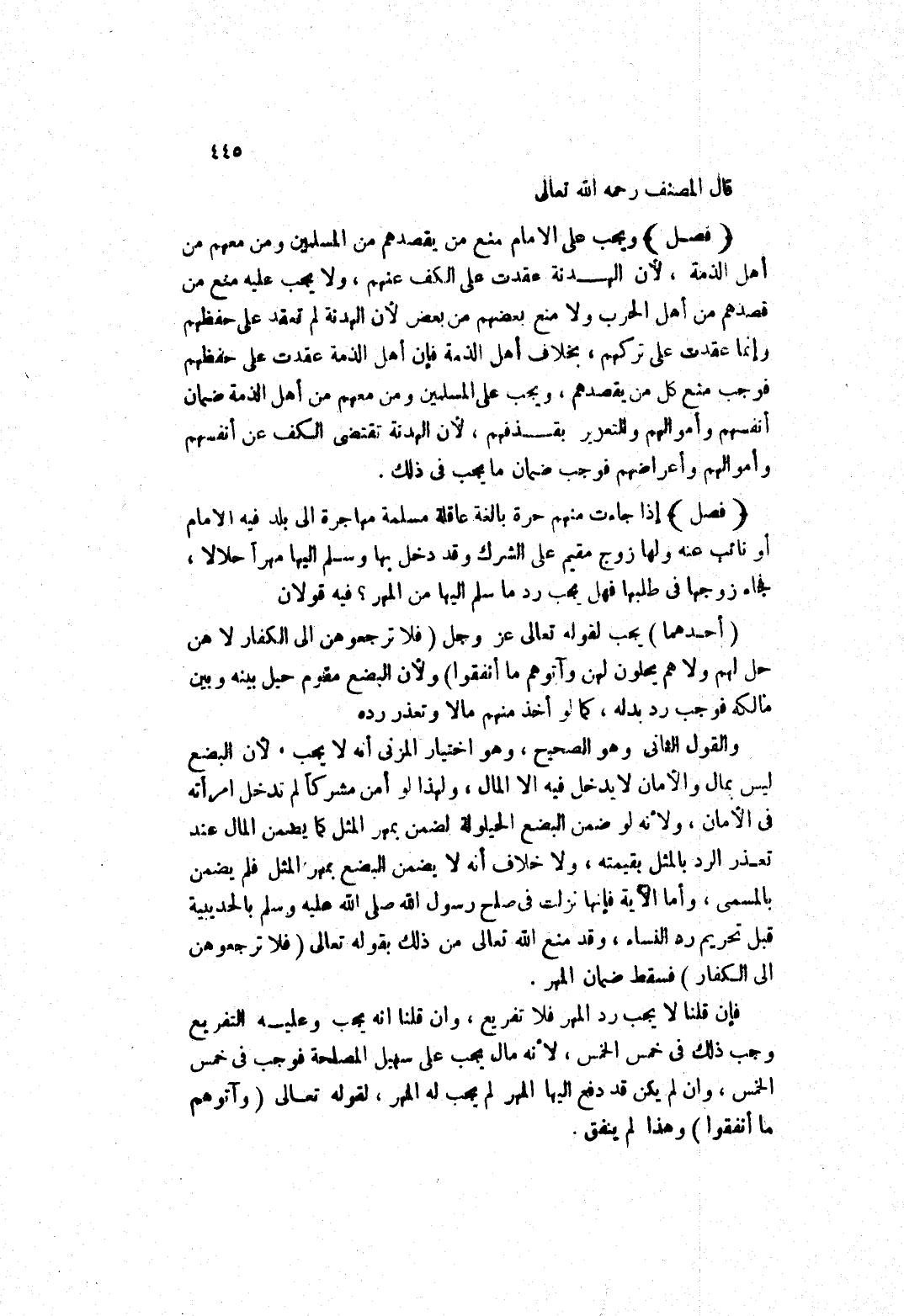 إذا جاءت منهم حرة بالغة عاقلة مسلمة مهاجرة إلى بلد فيه الامام أو نائب عنه ولها زوج مقيم على الشرك وقد دخل بها وسلم إليها مهرا حلالا، فجاء زوجها في طلبها فهل يجب رد ما سلم إليها من المهر؟ فيه قولان
