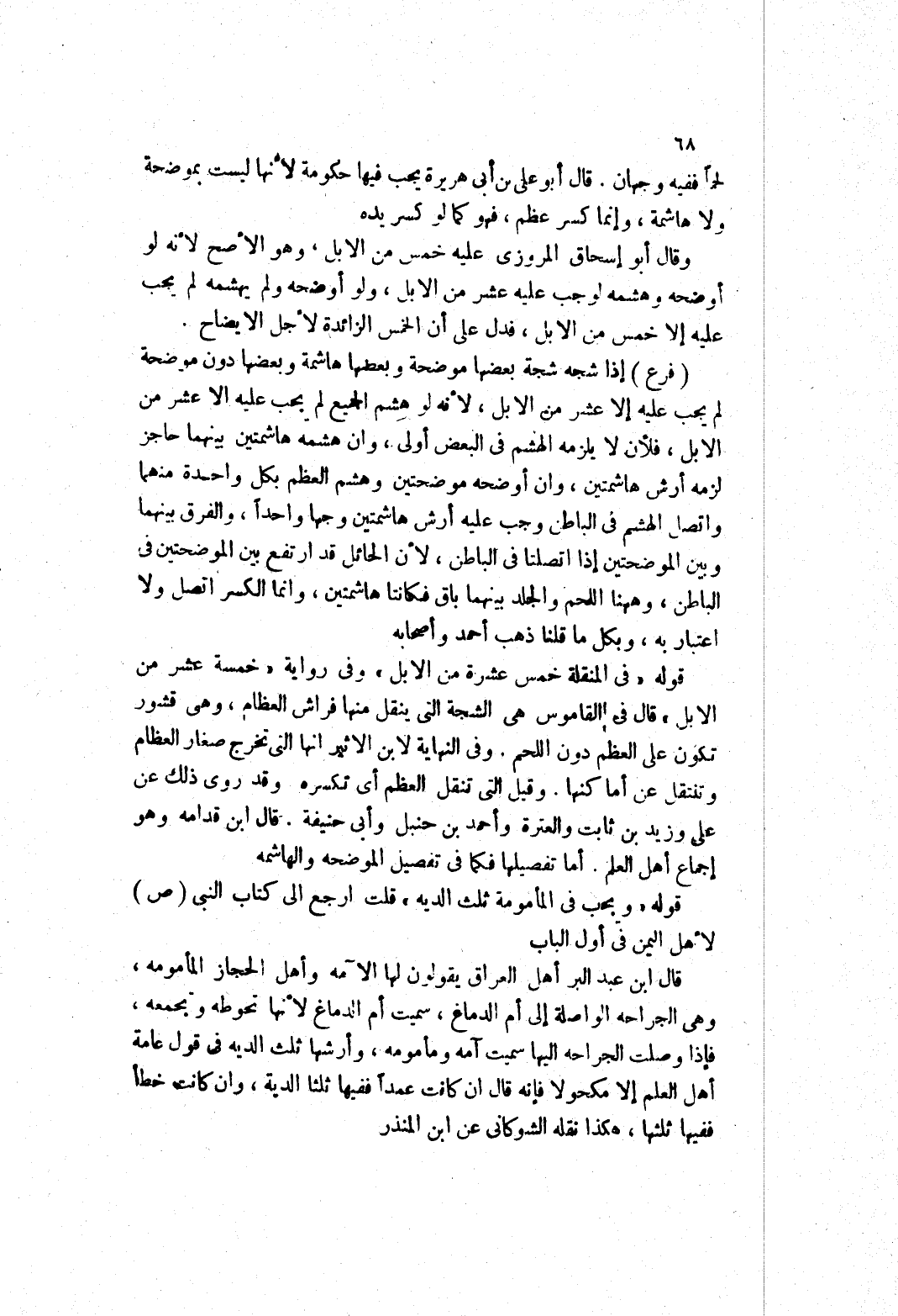 إذا شجه شجة بعضها موضحة وبعضها هاشمة وبعضها دون موضحة لم يجب عليه إلا عشر من الابل، لانه لو هشم الجميع لم يجب عليه الا عشر من الابل، فلان لا يلزمه الهشم في البعض أولى، وان هشمه هاشمتين بينهما حاجز لزمه أرش هاشمتين، وان أوضحه موضحتين وهشم العظم بكل واحدة منهما واتصل الهشم في البطان وجب عليه أرش هاشمتين وجها واحدا، والفرق بينهما وبين الموضحتين إذا اتصلتا في الباطن، لان الحائل قدر ارتفع بين الموضحتين في الباطن، وههنا اللحم والجلد بينهما باق فكاننا هاشمتين، وانما الكسر اتصل ولا اعتبار به، وبكل ما قلنا ذهب أحمد وأصحابه قوله (في المنقلة خمس عشرة من الابل) وفى رواية (خمسة عشر من الابل) قال في القاموس هي الشجة التى ينقل منها فراش العظام، وهى قشور تكون على العظم دون اللحم.