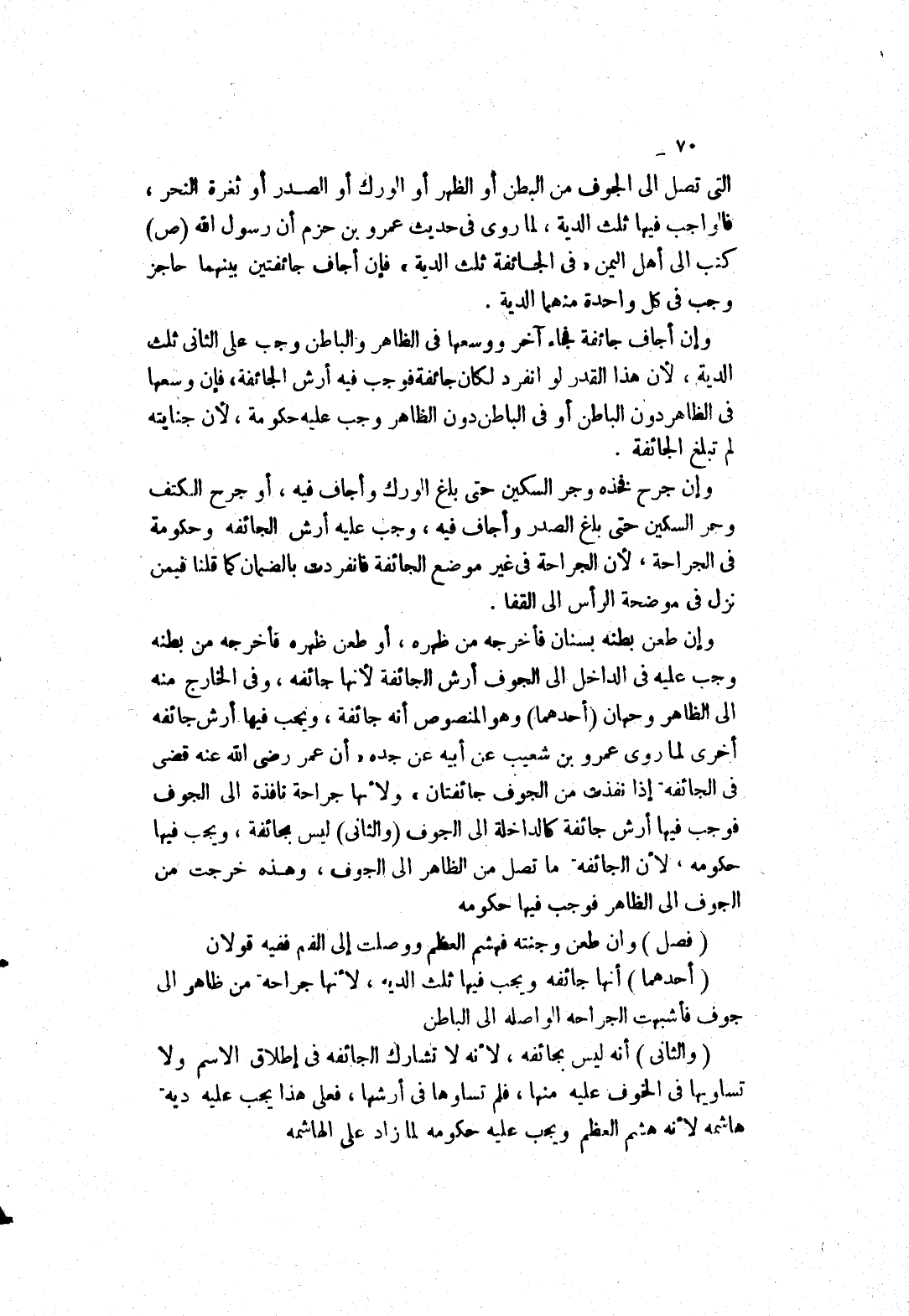 التى تصل إلى الجوف من البطن أو الظهر أو الورك أو الصدر أو ثغرة النحر، فالواجب فيها ثلث الدية، لما روى في حديث عمرو بن حزم أَنَّ رَسُولَ اللَّهِ صَلَّى اللَّهُ عَلَيْهِ وَسَلَّمَ كتب إلى أهل اليمن (في الجائفة ثلث الدية) فإن أجاف جائفتين بينهما حاجز وجب في كل واحدة منهما الدية.