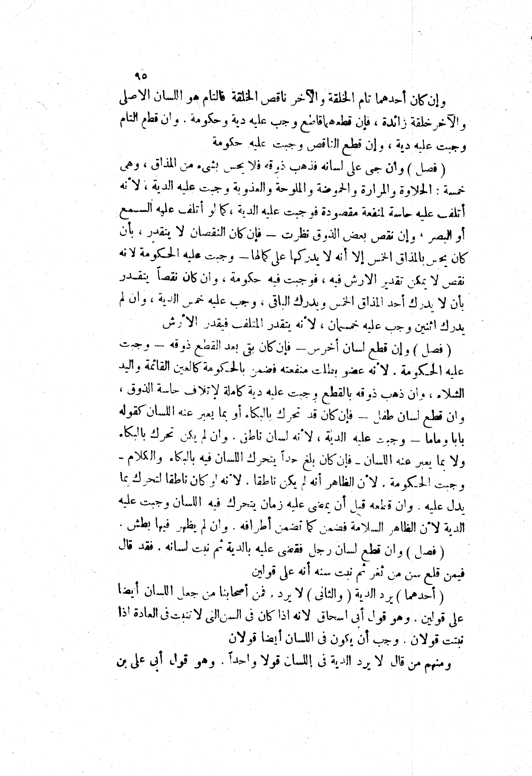 وان جنبى على لسانه فذهب ذوقه فلا يحس بشئ من المذاق، وهى خمسة: الحلاوة والمرارة والحموضة والملوحة والعذوبة وجبت عليه الدية، لانه أتلف عليه حاسة لمنفعة مقصودة فوجبت عليه الدية، كما لو أتلف عليه السمع أو البصر، وإن نقص بعض الذوق نظرت فإن كان النقصان لا يتقدر، بأن ك ان يحس بالمذاق الخمس إلا أنه لا يدركها على كمالها وجبت عليه الحكومة لانه نقص لا يمكن تقدير الارش فيه، فوجبت فيه حكومة، وان كان نقصا يتقدر بأن لا يدرك أحد المذاق الخمس ويدرك الباقي، وجب عليه خمس الدية، وان لم يدرك اثنين وجب عليه خمسمان، لانه يتقدر المتلف فيقدر الارش