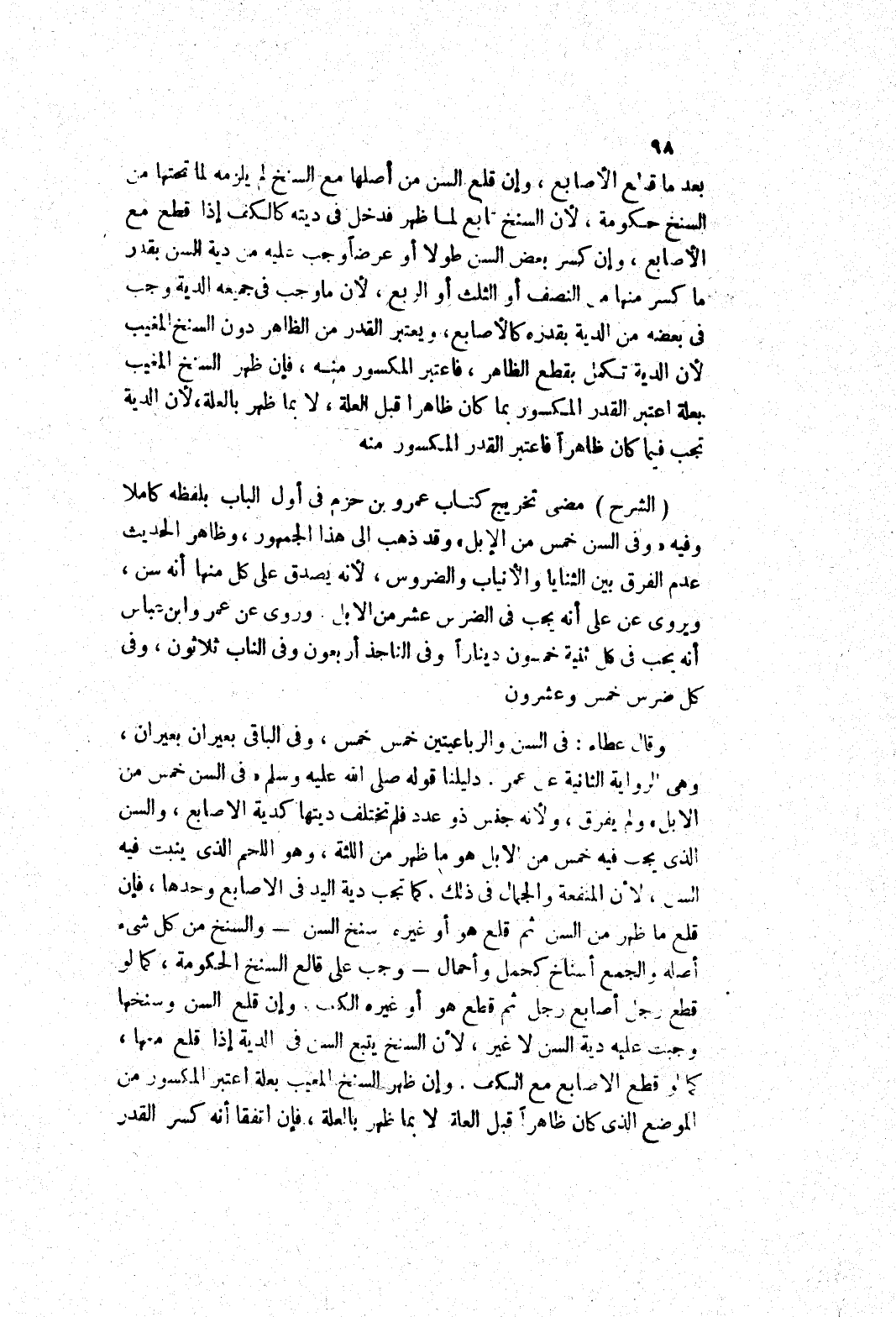 السنخ حكومة، لان السنخ تابع لما ظهر فدخل في ديته كالكف إذا قطع مع الاصابع، وإن كسر بعض السن طولا أو عرضا وجب عليه من دية السن بقدر ما كسر منها من النصف أو الثلث أو الربع، لان ما وجب في جميعه الدية وجب في بعضه من الدية بقدره كالاصابع، ويعتبر القدر من الظاهر دون السنخ المغيب لان الدية تكمل بقطع الظاهر، فاعتبر المكسور منه، فإن ظهر السنخ المغيب بعلة اعتبر القدر المكسور بما كان ظاهرا قبل العلة، لا بما ظهر بالعلة، لان الدية تجب فيما كان ظاهرا فاعتبر القدر المكسور منه (الشرح) مضى تخريج كتاب عمرو بن حزم في أول الباب بلفظه كاملا وفيه (وفى السن خمس من الابل) وقد ذهب إلى هذا الجمهور، وظاهر الحديث عدم الفرق بين الثنايا والانياب والضروس، لانه يصدق على كل منها أنه سن، ويروى عن على أنه يجب في الضرس عشر من الابل وروى عن عمر وابن عباس أنه يجب في كل ثنية خمسون دينارا وفى الناجذ أربعون وفى الناب ثلاثون، وفى كل ضرس خمس وعشرون وقال عطاء: في السن والرباعيتين خمس خمس، وفى الباقي بعيران بعيران، وهى الرواية الثانية عن عمر.