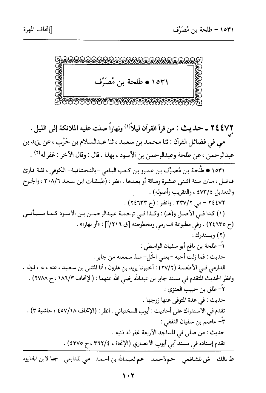 24472 - مي - حديث: من قرأ القرآن ليلاً ونهاراً صلت عليه الملائكة إلى الليل. مي في فضائل القرآن: ثنا محمد بن سعيد، ثنا عبد السلام بن حَرْب، عن يزيد بن عبد الرحمن، عن طلحة وعبد الرحمن بن الأسود، بهذا. قال: وقال الآخر: غفر له.