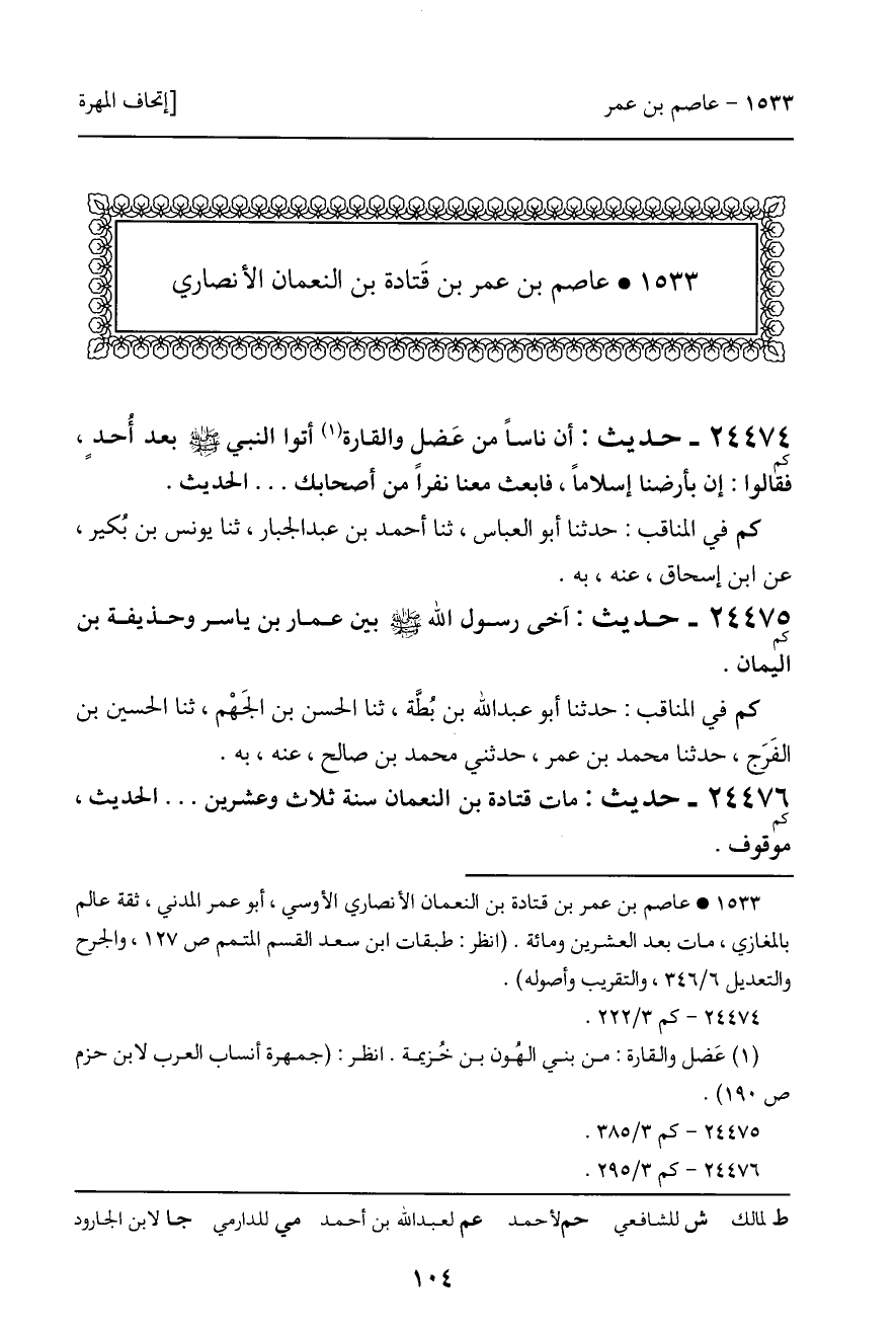 24474 - كم - حديث: أن ناساً من عَضل والقارة أتوا النبي صلى الله عليه وسلم بعد أُحدٍ، فقالوا: إن بأرضنا إسلاماً، فابعث معنا نفراً من أصحابك ... الحديث. كم في المناقب: حدثنا أبو العباس، ثنا أحمد بن عبد الجبار، ثنا يونس بن بُكير، عن ابن إسحاق، عنه، به.
