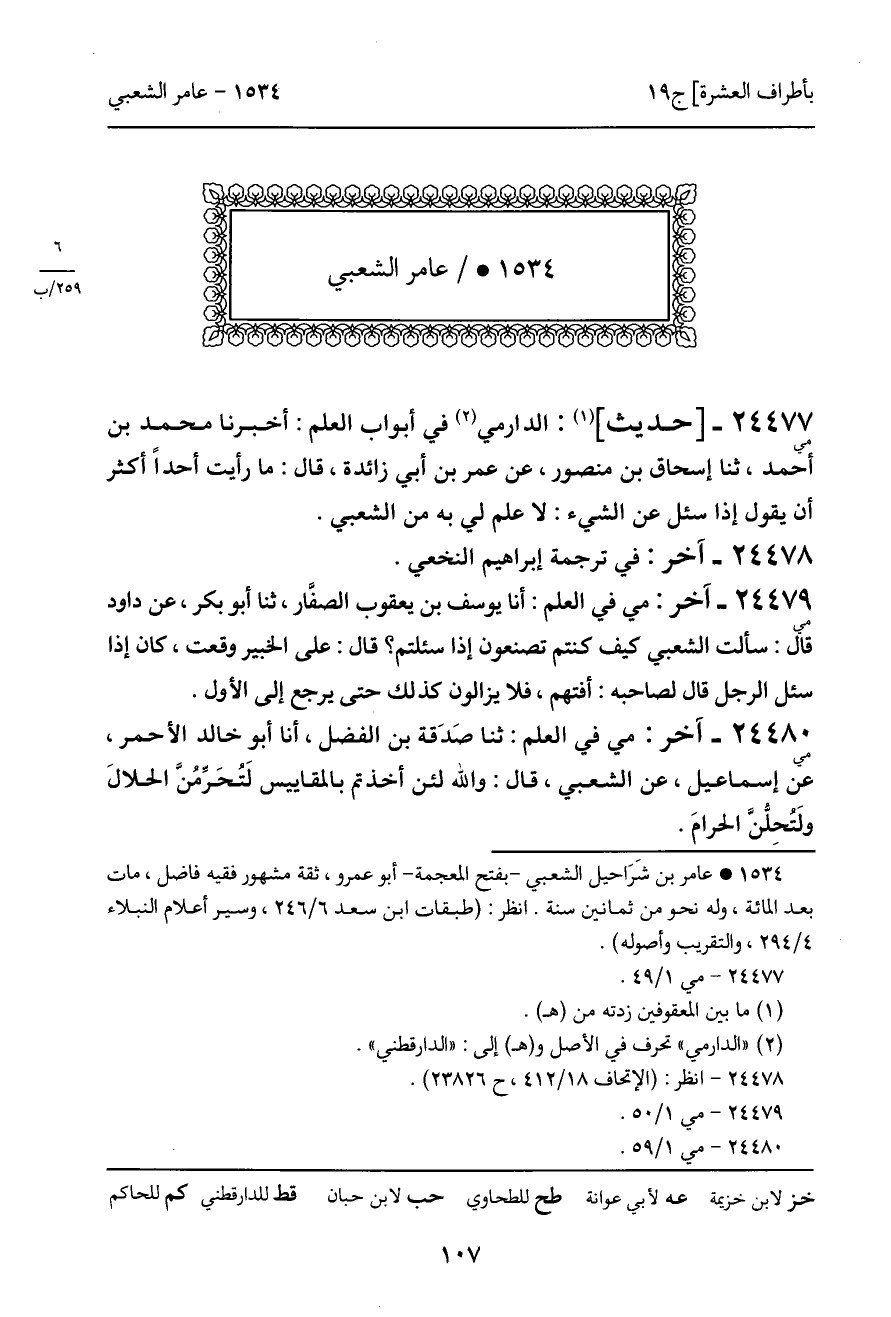 24480 - مي - آخر: مي في العلم: ثنا صَدَقة بن الفضل، أنا أبو خالد الأحمر، عن إسماعيل، عن الشعبي، قال: والله لئن أخذتم بالمقاييس لَتُحَرَّمُنَّ الحلالَ ولَتُحِلُّنَّ الحرامَ.