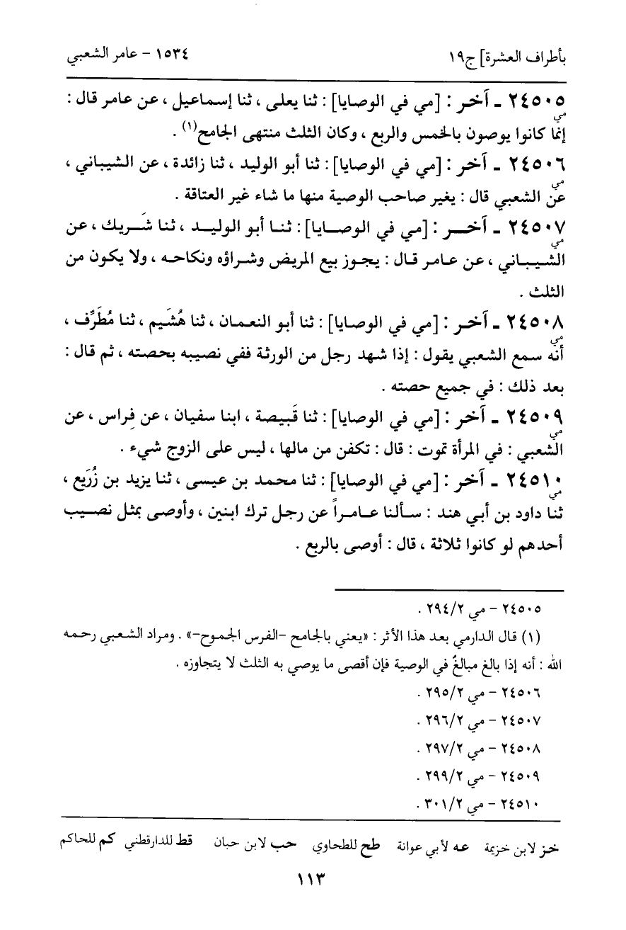 24508 - مي - آخر: [مي في الوصايا] : ثنا أبو النعمان، ثنا هُشَيم، ثنا مُطَرَّف، أنه سمع الشعبي يقول: إذا شهد رجل من الورثة ففي نصيبه بحصته، ثم قال: بعد ذلك: في جميع حصته.