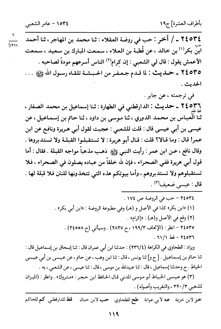 24536 - قط طح - حديث: الدارقطني في الطهارة: ثنا إسماعيل بن محمد الصفار، ثنا العباس بن محمد الدوري، ثنا موسى بن داود، ثنا حاتم بن إسماعيل، عن عيسى بن أبي عيسى قال: قلت للشعبي: عجبت لقول أبي هريرة ونافع عن ابن عمر! قال: وما قالا؟ قلت: قال أبو هريرة: لا تستقبلوا القبلة ولا تستدبروها. وقال نافع، عن ابن عمر: رأيت النبي صلى الله عليه وسلم ذهب مذهباً مواجه القبلة. فقال: أما قول أبي هريرة ففي الصحراء، فإن لله خلقاً من عباده يصلون في الصحراء، فلا تستقبلوهم ولا تستدبروهم، وأما بيوتكم هذه التي تتخذونها للنتن فلا قبلة لها. قال: عيسى ضعيف.