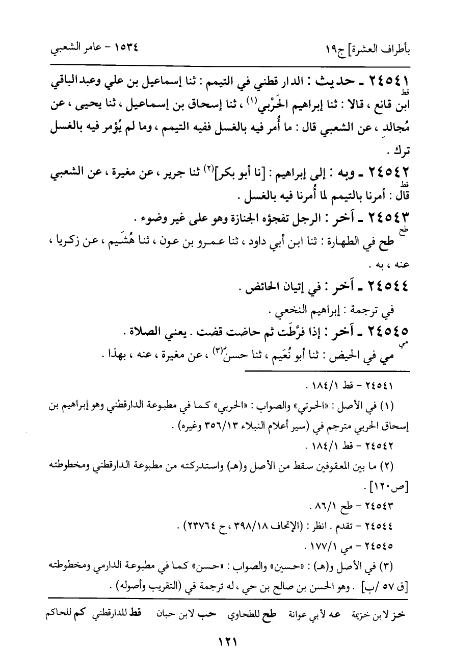 24541 - قط - حديث: الدارقطني في التيمم: ثنا إسماعيل بن علي وعبد الباقي ابن قانع، قالا: ثنا إبراهيم الحَرْبي، ثنا إسحاق بن إسماعيل، ثنا يحيى، عن مُجالِد، عن الشعبي قال: ما أمر فيه بالغسل ففيه التيمم، وما لم يُؤمر فيه بالغسل ترك.