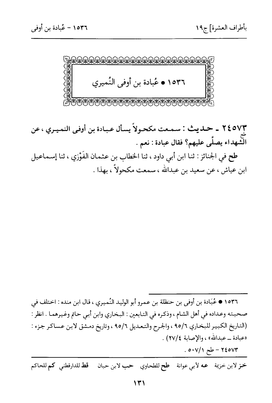 24573 - طح - حديث: سمعت مكحولاً يسأل عبادة بن أوفى النميري، عن الشهداء يصلَّى عليهم؟ فقال عبادة: نعم. طح في الجنائز: ثنا ابن أبي داود، ثنا الخطاب بن عثمان الفَوْزي، ثنا إسماعيل ابن عياش، عن سعيد بن عبد الله، سمعت مكحولاً، بهذا.