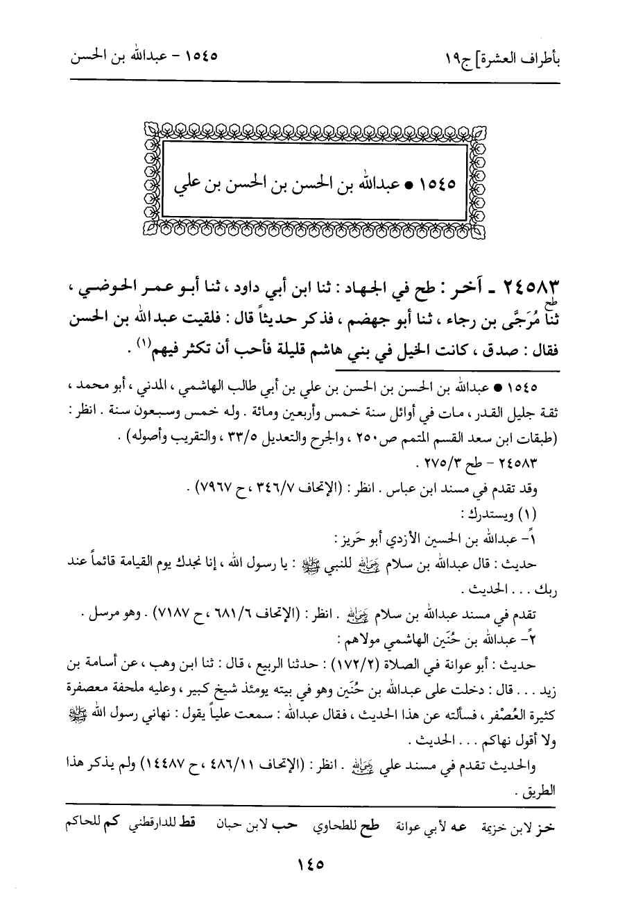 24583 - طح - آخر: طح في الجهاد: ثنا ابن أبي داود، ثنا أبو عمر الحوضي، ثنا مُرَجَّى بن رجاء، ثنا أبو جهضم، فذكر حديثاً قال: فلقيت عبد الله بن الحسن فقال: صدق، كانت الخيل في بني هاشم قليلة فأحب أن تكثر فيهم.