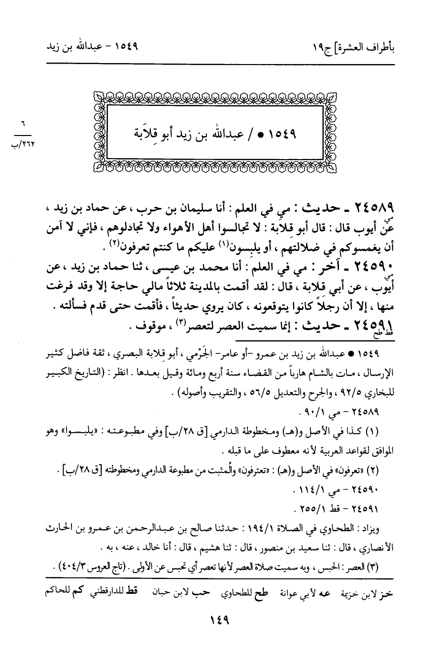 24590 - مي - آخر: مي في العلم: أنا محمد بن عيسى، ثنا حماد بن زيد، عن أيوب، عن أبي قِلابة، قال: لقد أقمت بالمدينة ثلاثاً مالي حاجة إلا وقد فرغت منها، إلا أن رجلاً كانوا يتوقعونه، كان يروي حديثاً، فأقمت حتى قدم فسألته.
